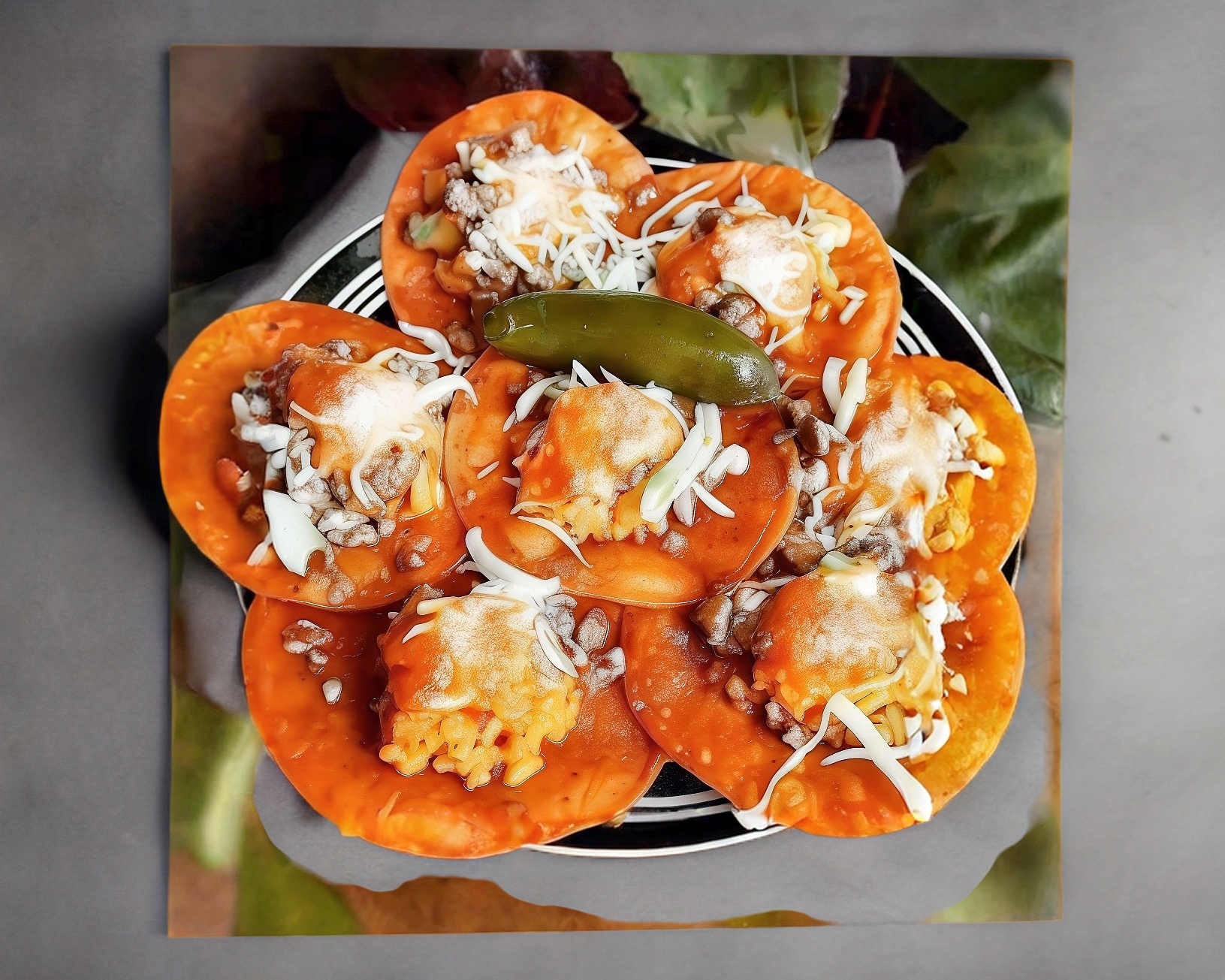 8 Tamborcitos rellenos de pollo, revoltillo, incluye cueritos y chiles en vinagre.