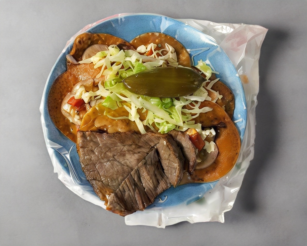 6 Tamborcitos rellenos de pollo, revoltillo y puerco, 6 enchiladas incluye cecina, lechuga y chiles en vinagre.