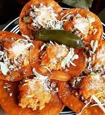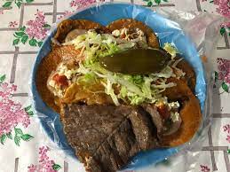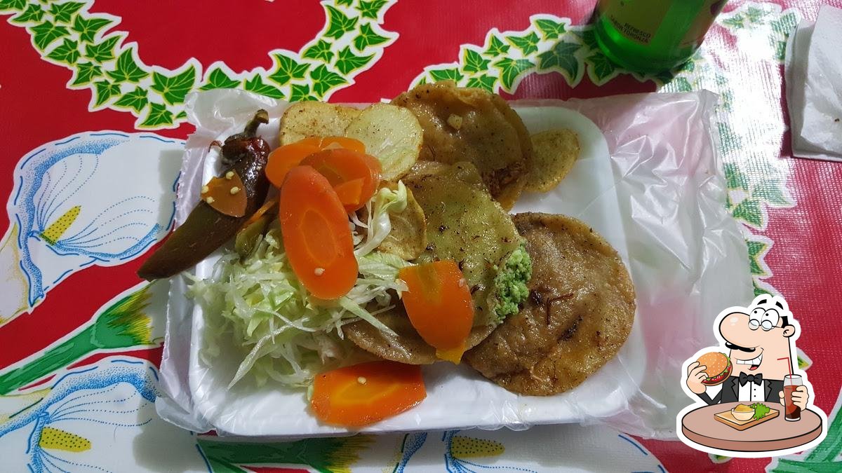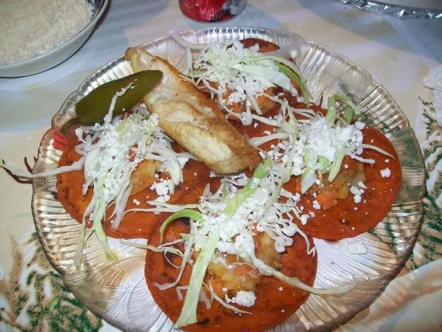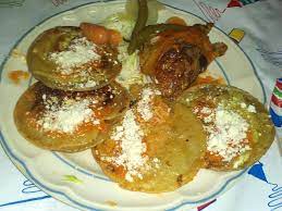 6 Tamborcitos rellenos de pollo, revoltillo y puerco, 6 Enchiladas incluye pollo, lechuga y chiles en vinagre.