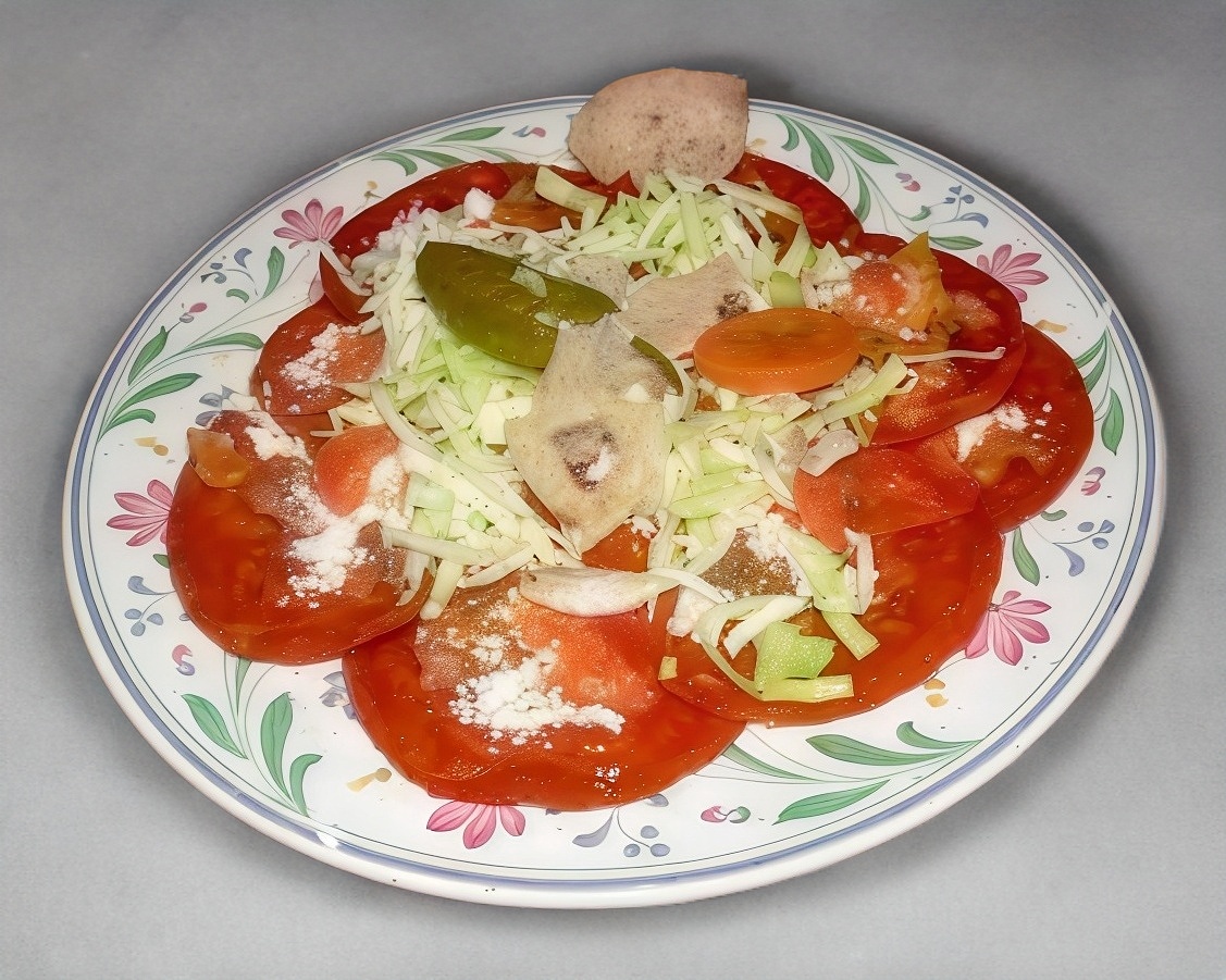 Queso, papa, zanahoria, lechuga y cueritos.