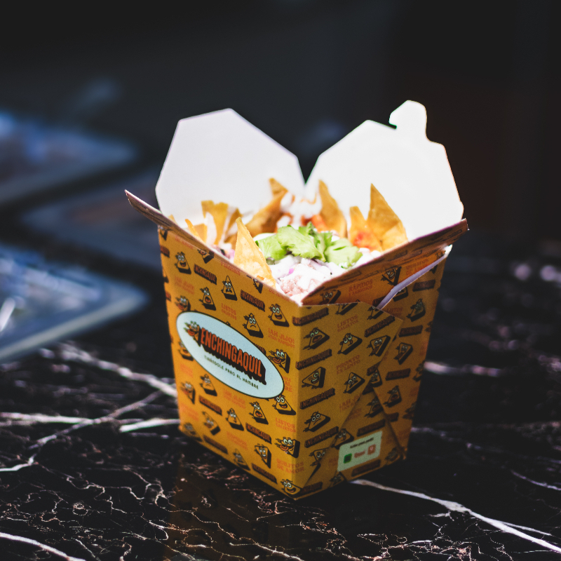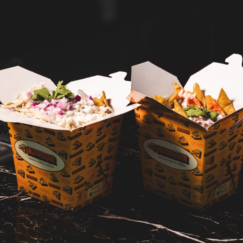 Crujientes totopos con salsa artesanal, acompañados de trozos de chicharrón, crema, queso y vegetales frescos.