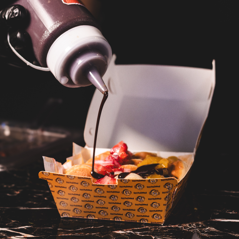 Una docena de mini hotcakes, acompañados de un topping y dos jarabes a tu elección.