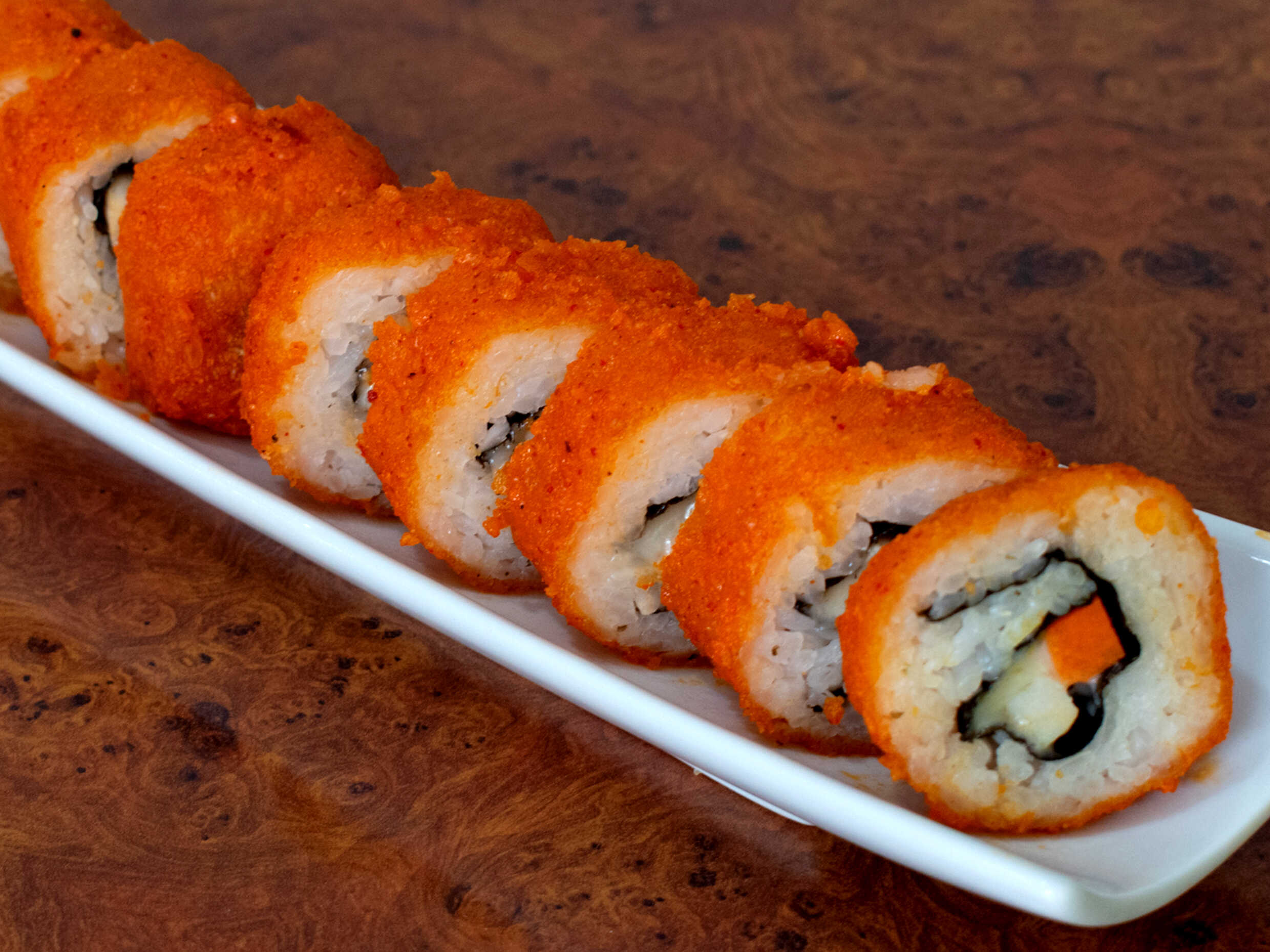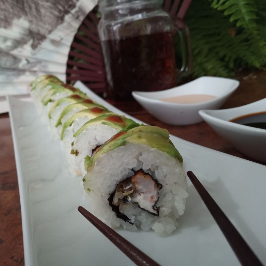 Por dentro camarón, queso crema y chiles, por fuera aguacate y sriracha, incluye salsa de soya.