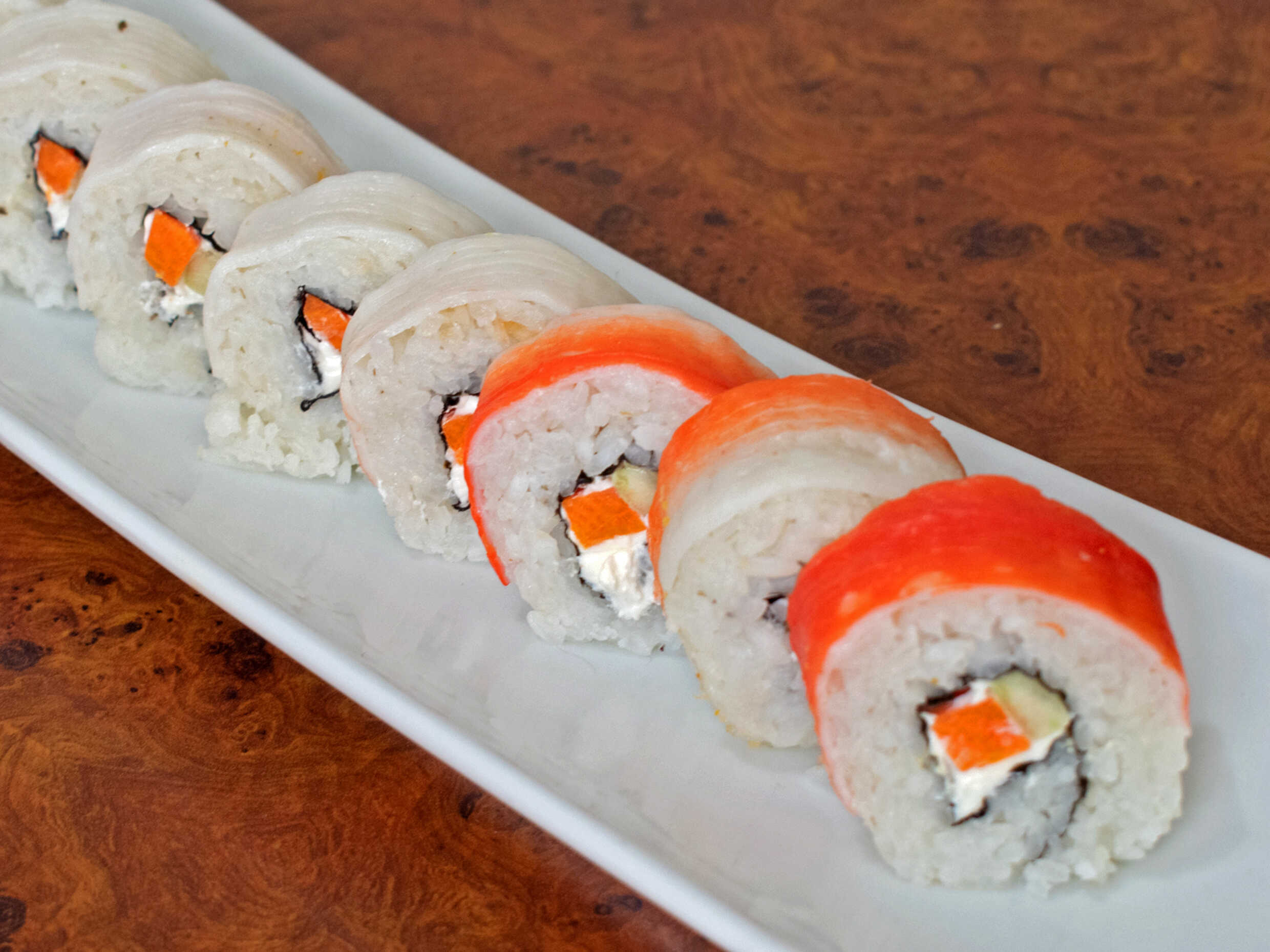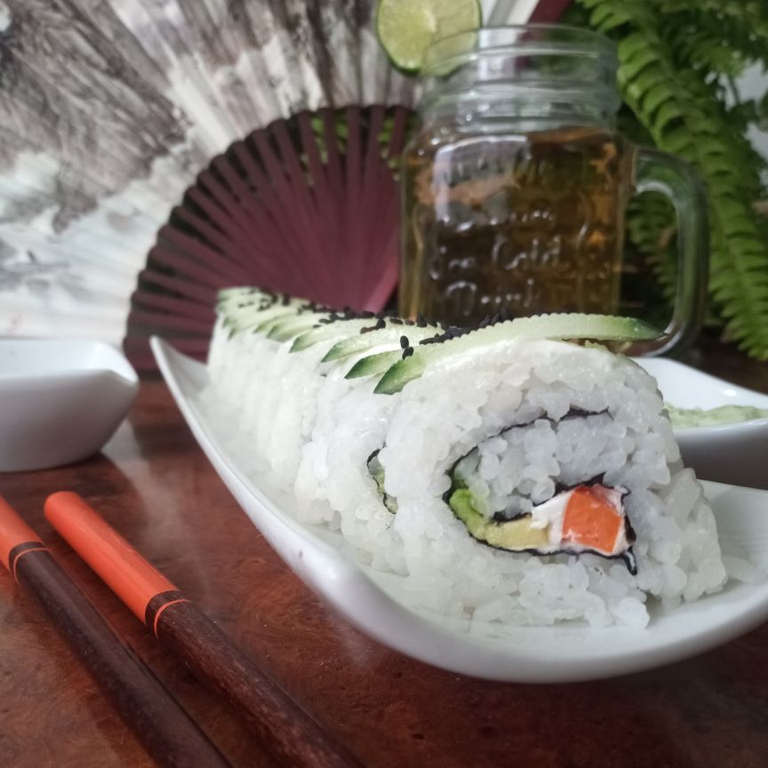 Por dentro pepino, zanahoria, queso crema y aguacate, por fuera surimi, incluye salsa de soya.