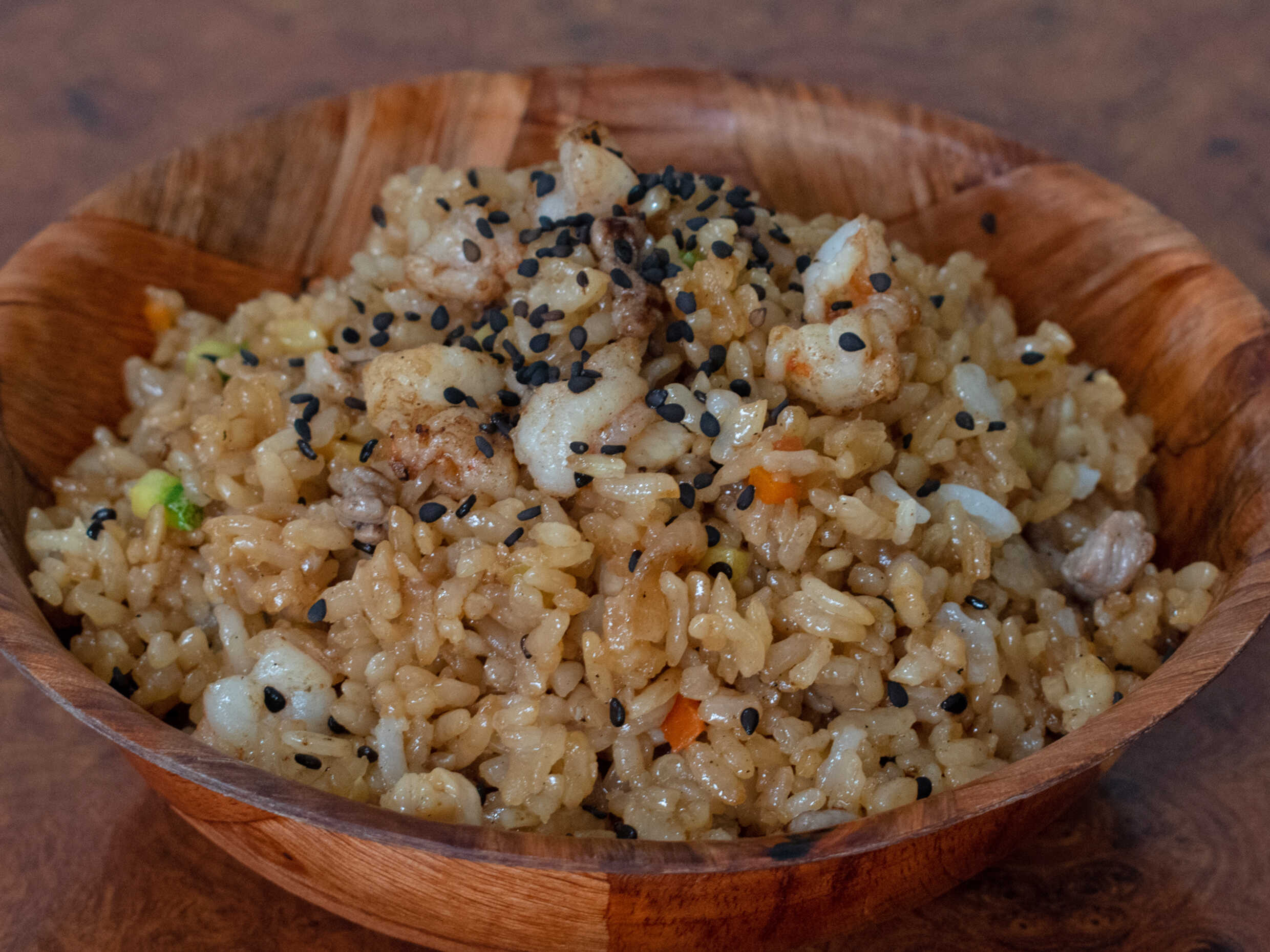 Arroz frito con pollo, camarón, arrachera, zanahoria, cebollín y champiñón. Sazonado con el sabor de la casa.