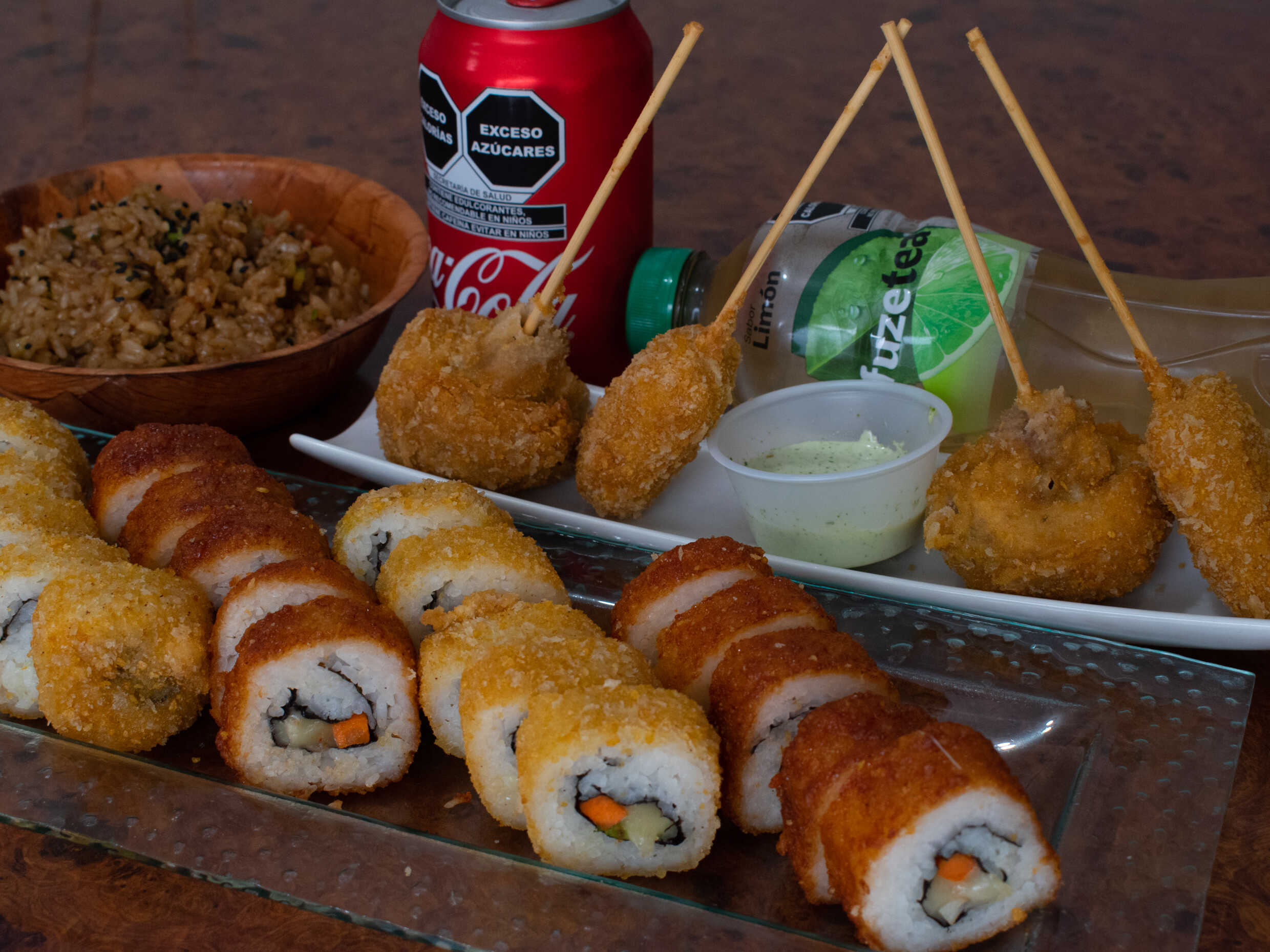 4 rollos a elegir, 2 ordenes de arroz frito vegetariano, 4 ordenes de brochetas mixtas champiñon y queso.