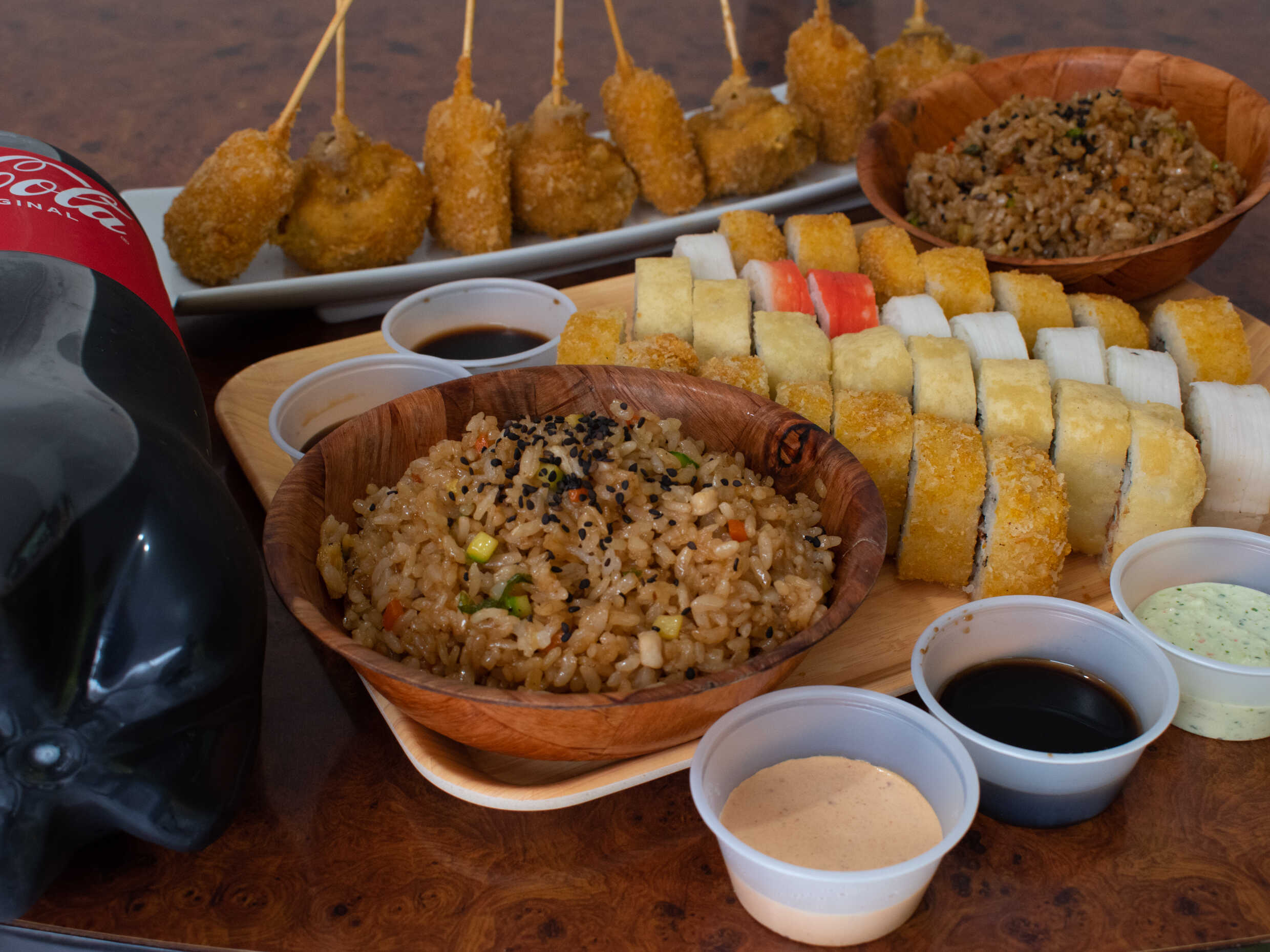 2 rollos, 2 ordenes de brochetas, arroz frito vegetariano.