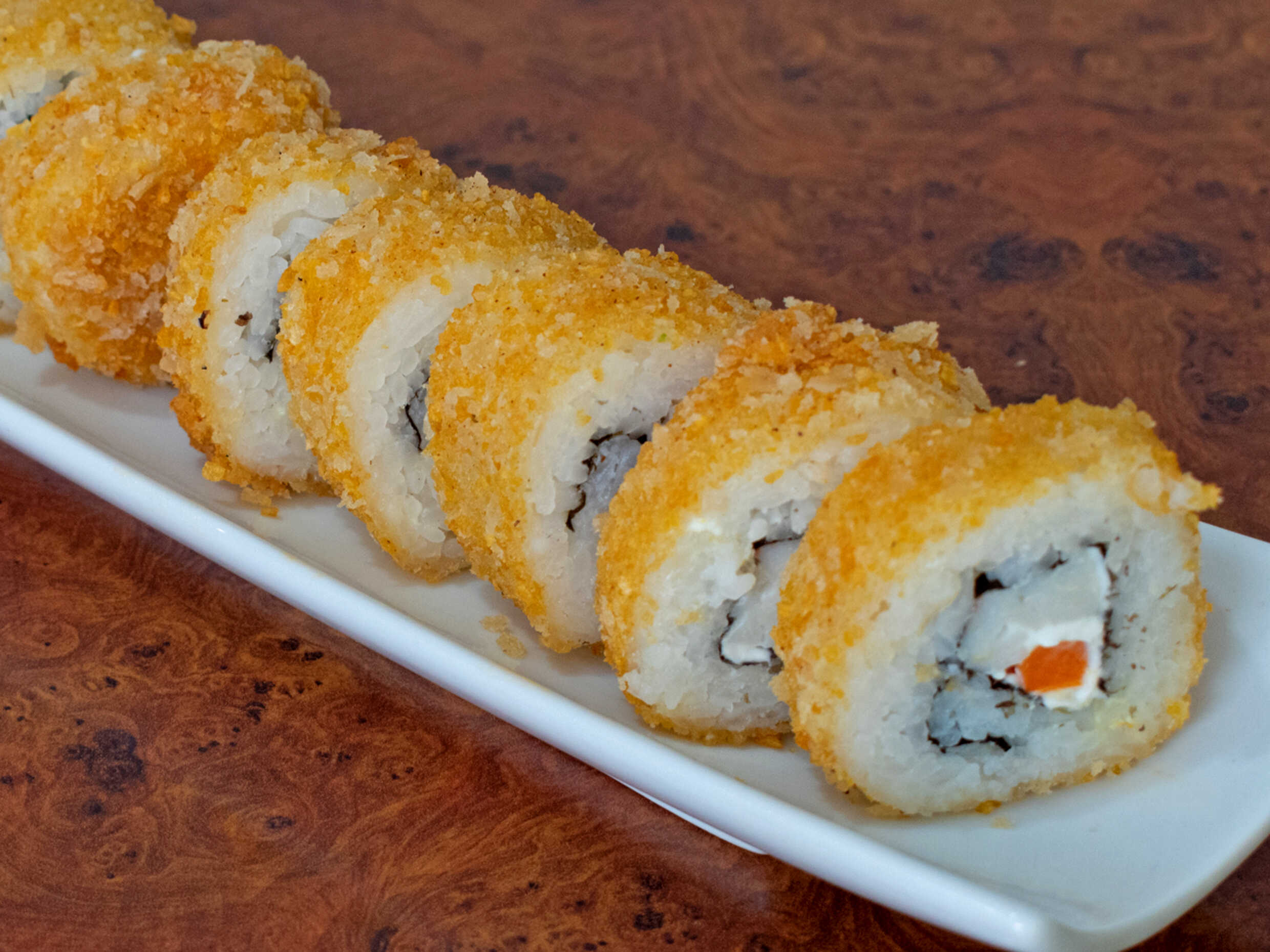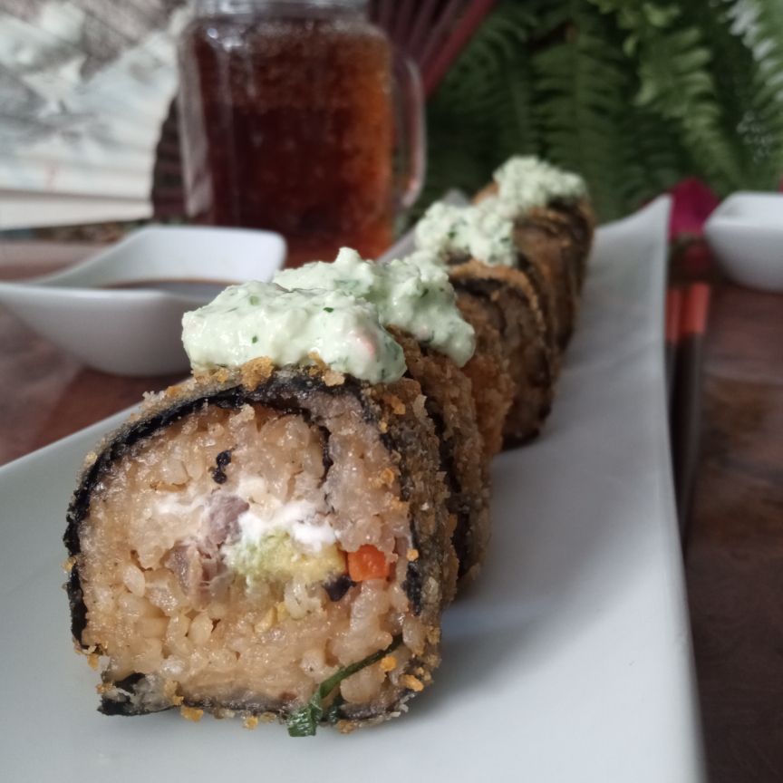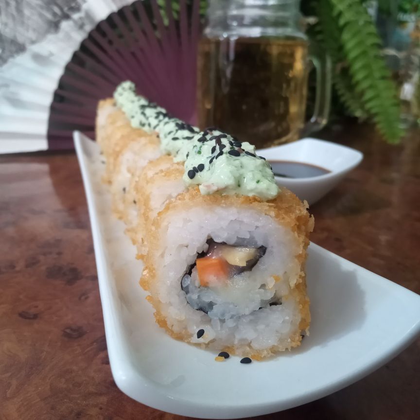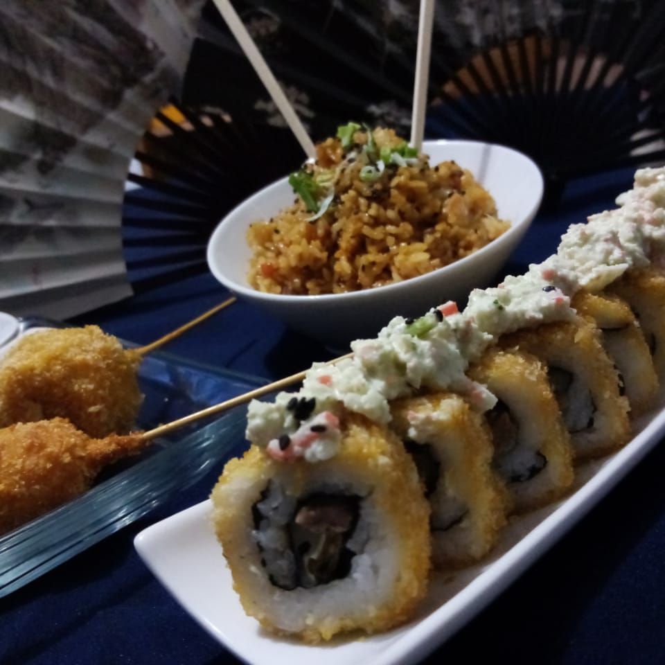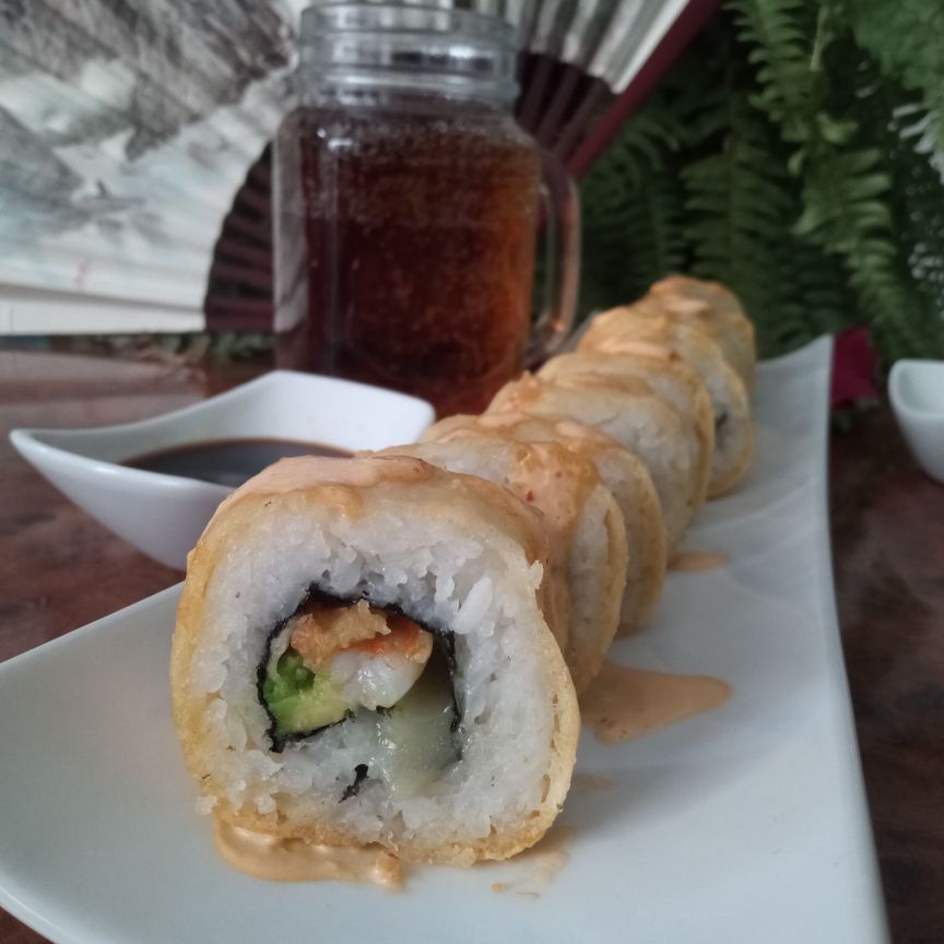 Por dentro arroz frito de la casa con queso crema, arrachera, aguacate, por fuera empanizado, acompañado de tampico y soya.