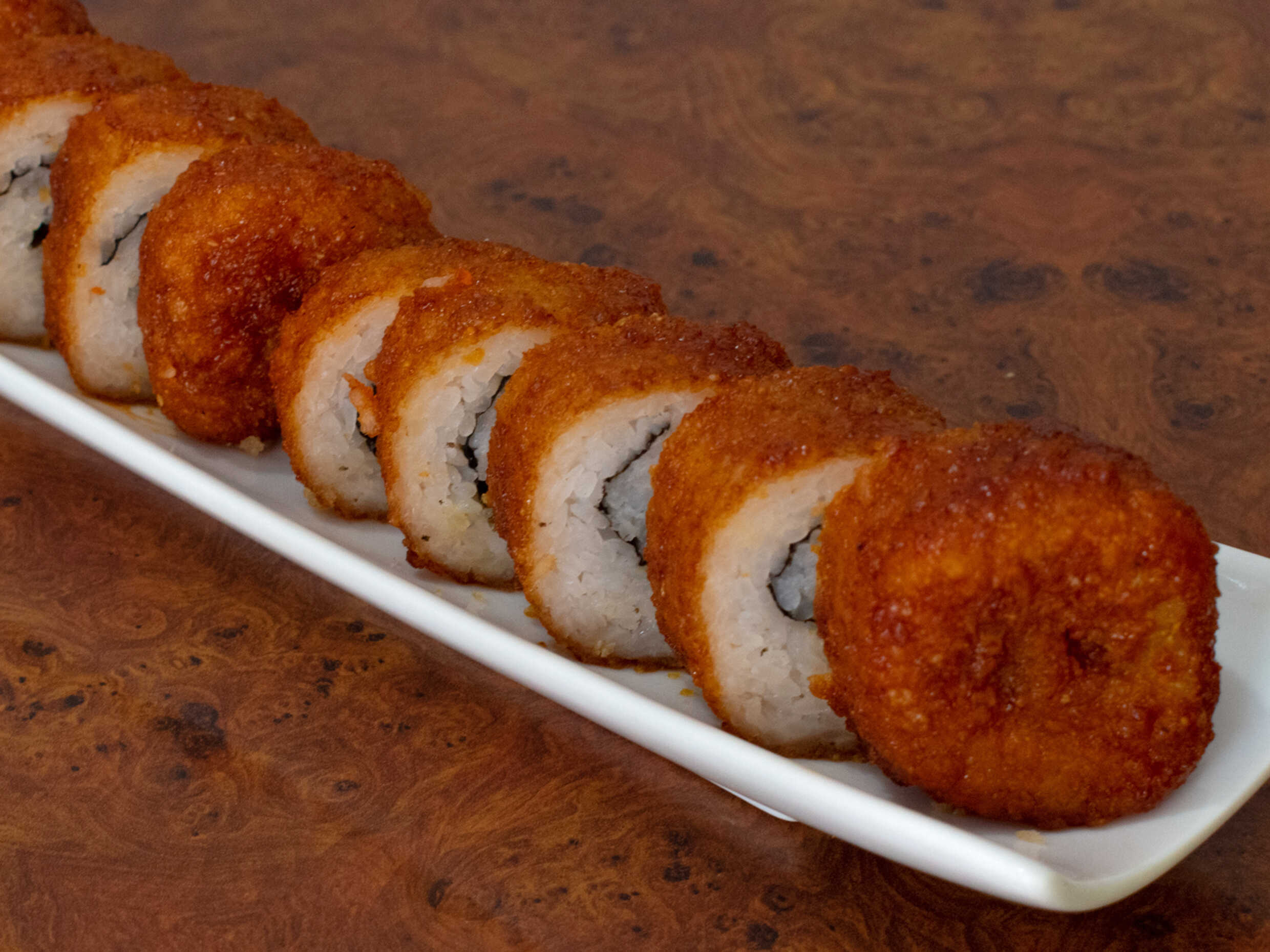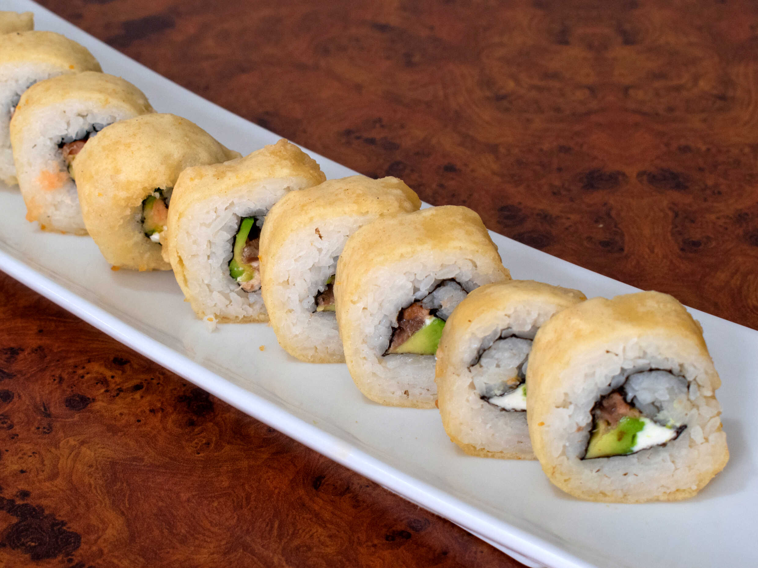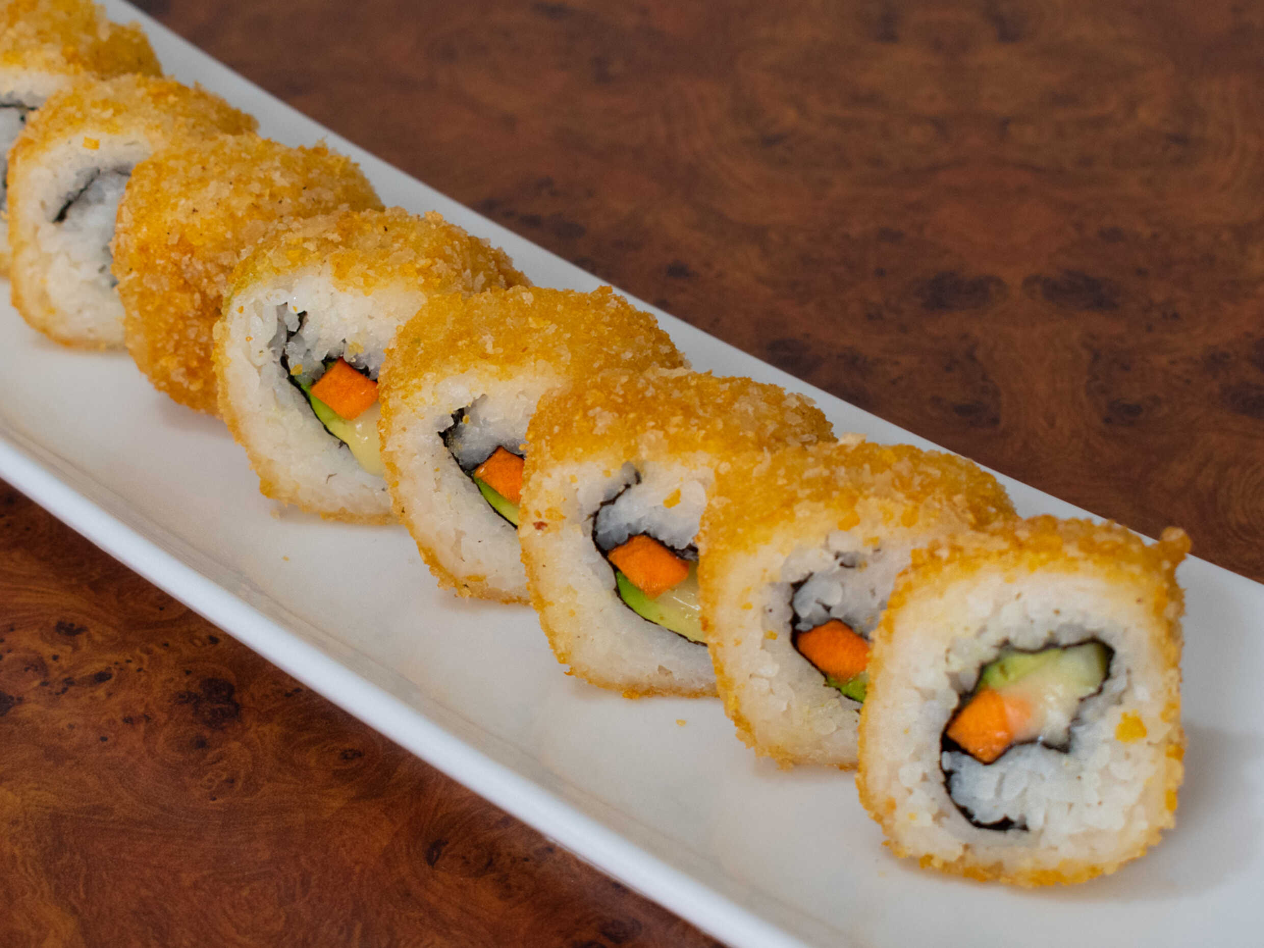 Por dentro arroz frito de la casa con queso crema, arrachera, aguacate, por fuera empanizado, acompañado de tampico y soya.
