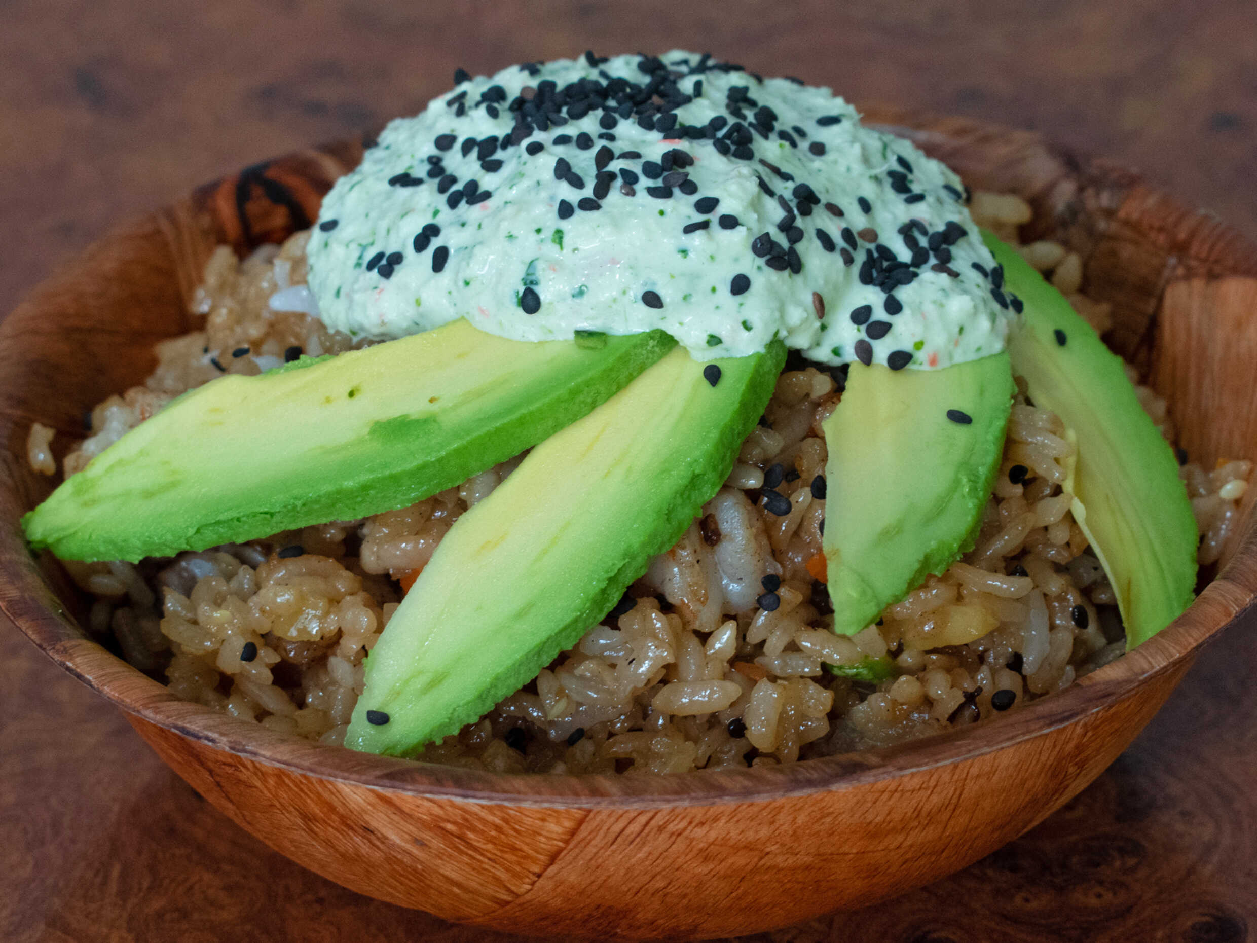 Arroz frito con pollo, camarón, arrachera, zanahoria, cebollín y champiñón. Sazonado con el sabor de la casa, acompañado con salsa tampico y aguacate.