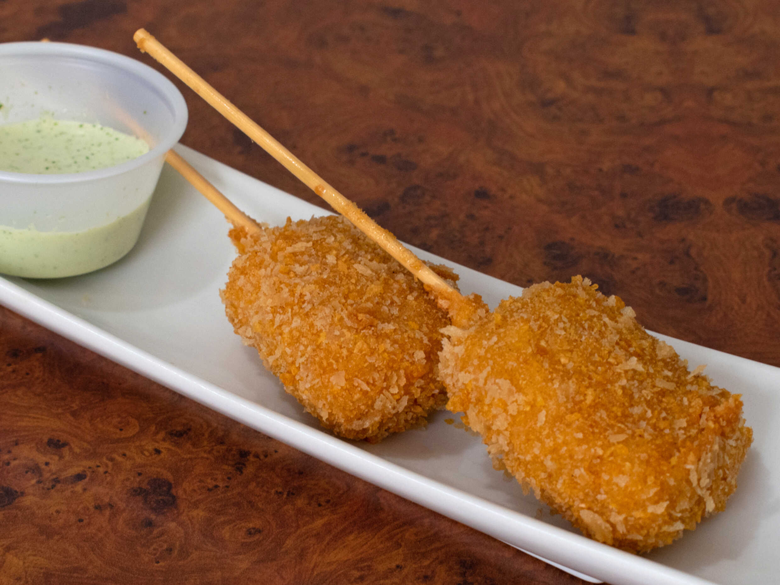 Por dentro pollo, queso gouda y zanahoria, por fuera tampico, incluye salsa de soya.