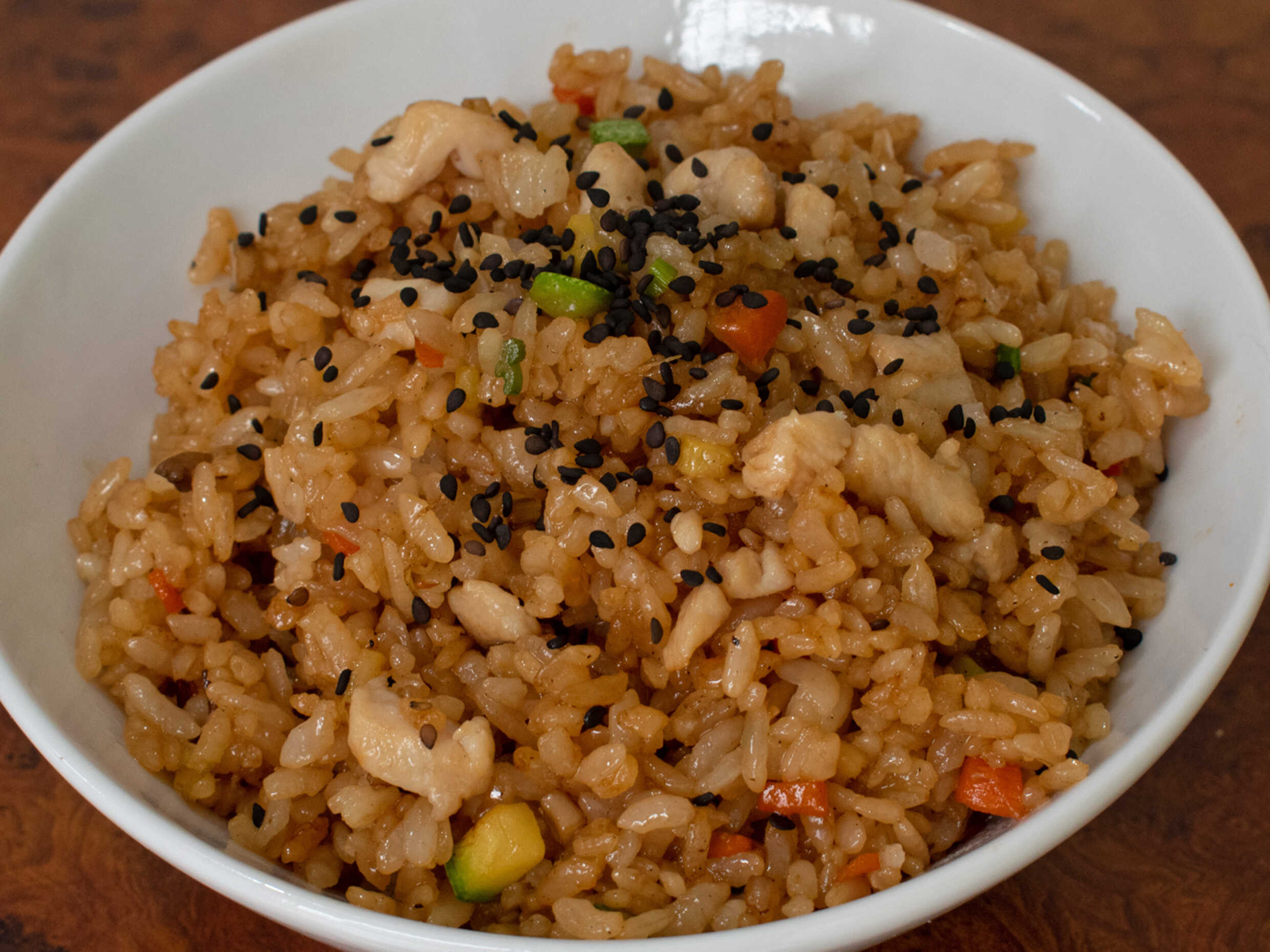 Arroz frito con pollo, zanahoria, cebollín y champiñón. Sazonado con el sabor de la casa.