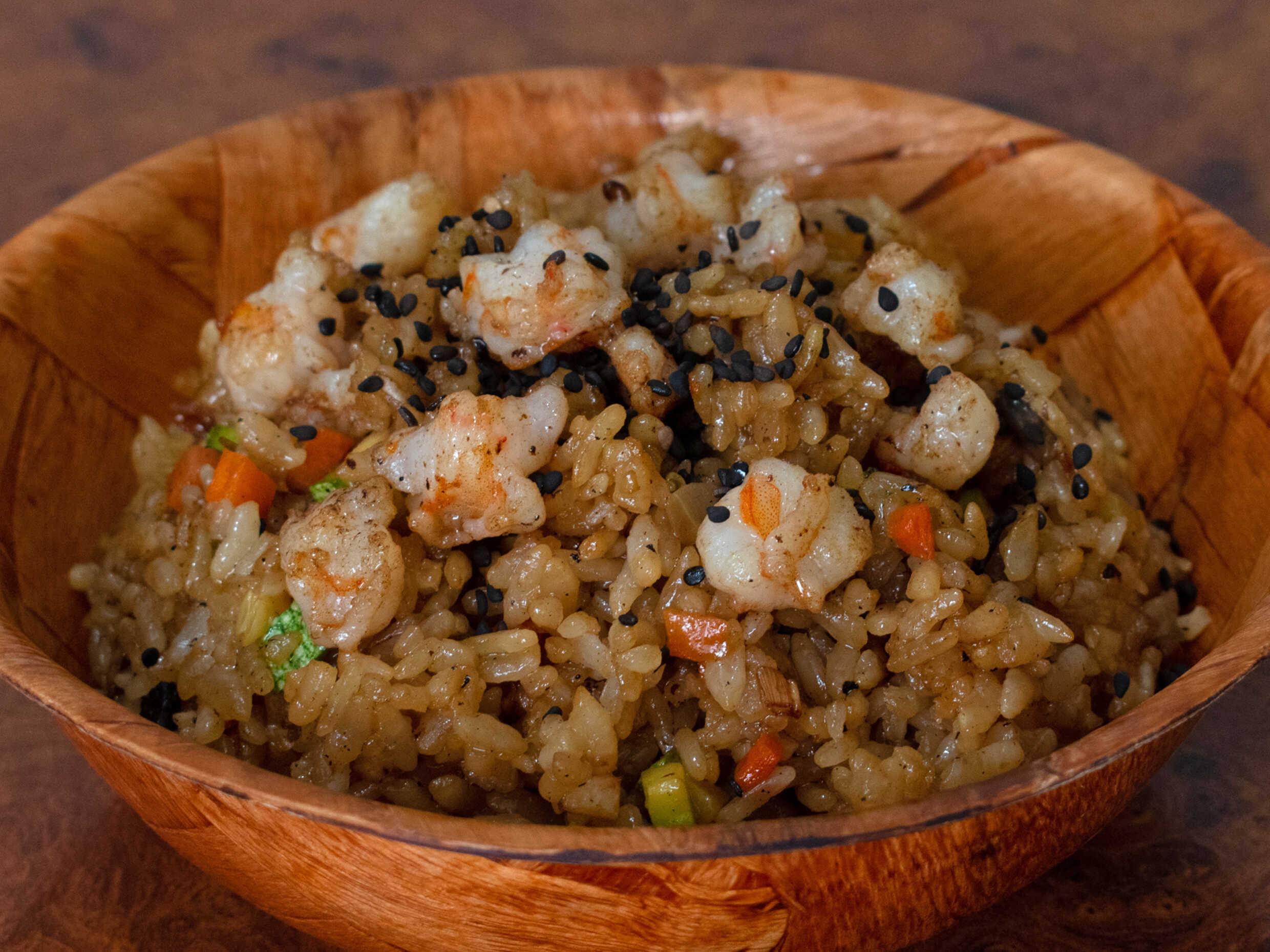 Arroz frito con camarón, calabaza, zanahoria, cebollín y champiñón. Sazonado con el sabor de la casa.