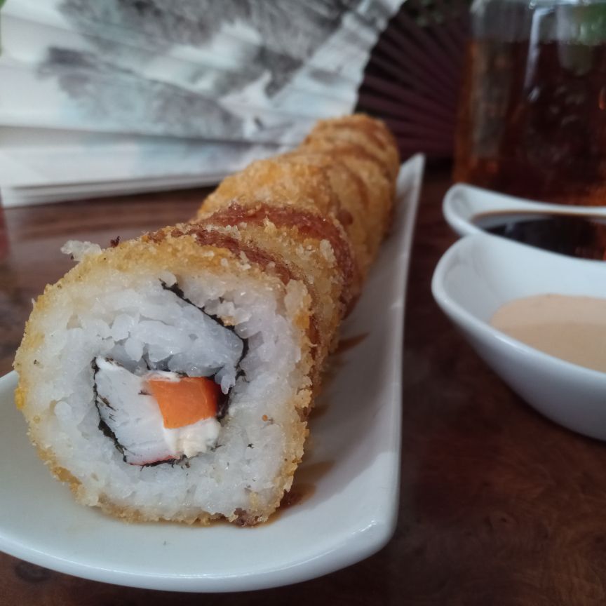 Por dentro pollo, queso crema y aguacate, por fuera ajonjolí, incluye salsa de soya.