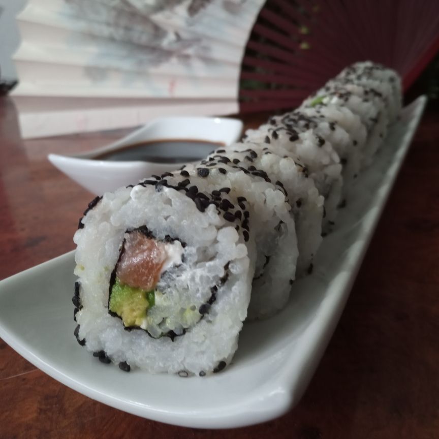 Por dentro salmón, queso crema y aguacate, por fuera ajonjolí, incluye salsa de soya.