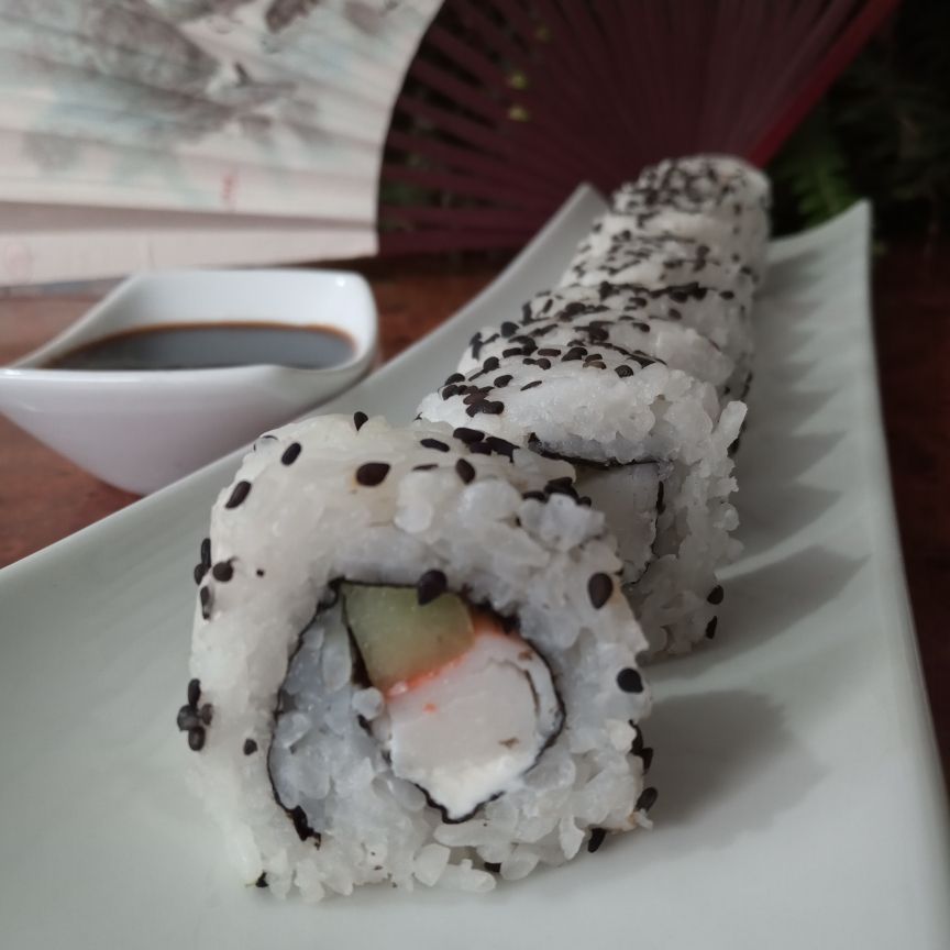 Por dentro surimi, queso crema y pepino, por fuera ajonjolí, incluye salsa de soya.