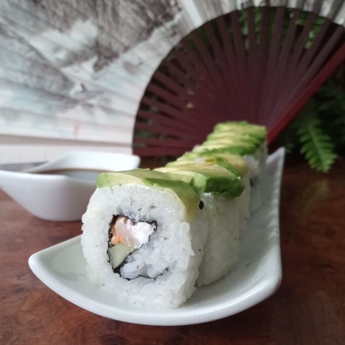Por dentro camarón, queso crema y pepino, por fuera aguacate, incluye salsa de soya.