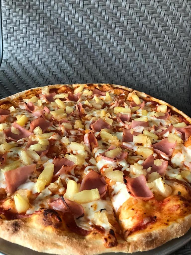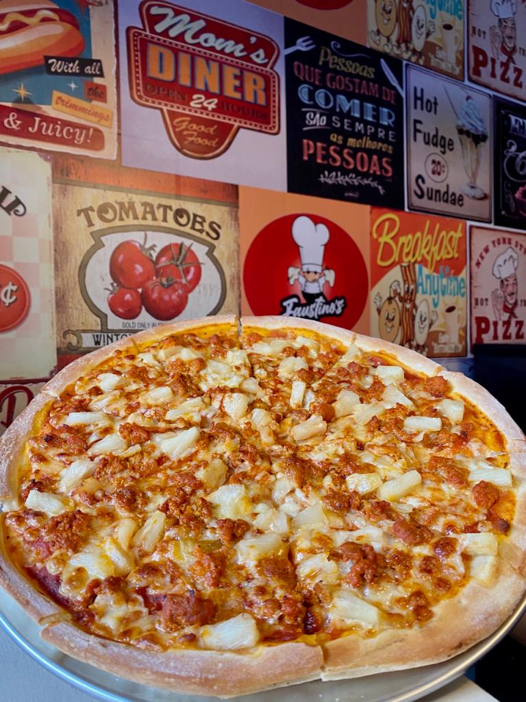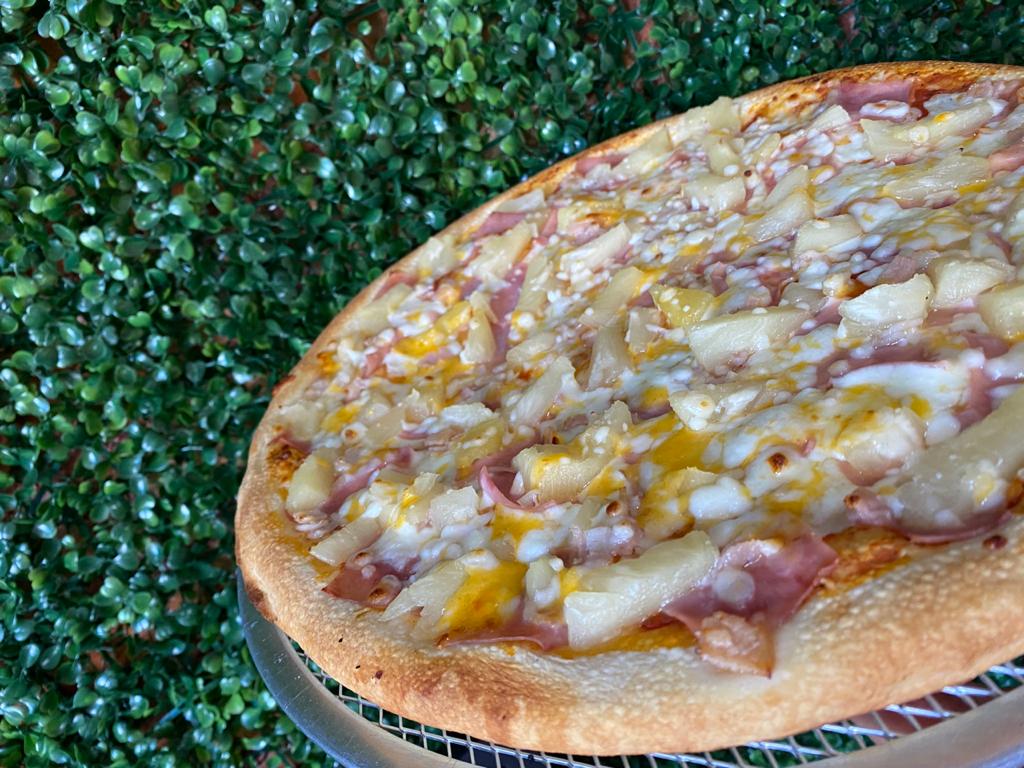 Pizza grande con mozzarella, jamón, piña, tocino y mezcla de 4 quesos.