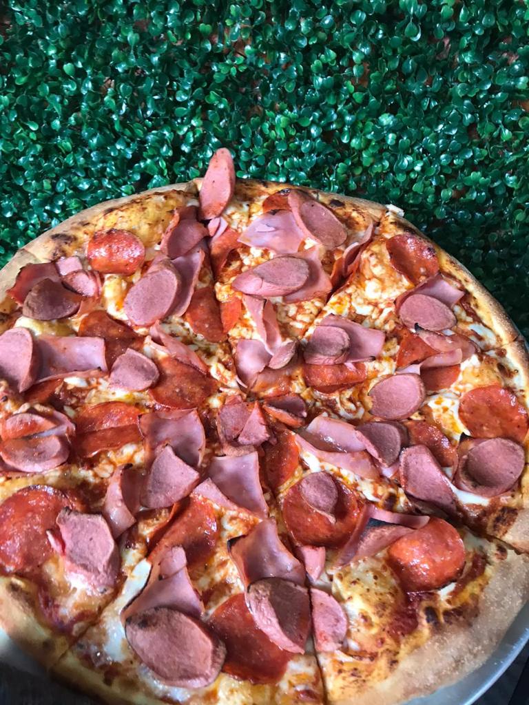 Pizza grande con mozzarella, pepperoni, jamón y salchicha.