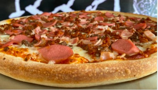 Pizza grande con mozzarella, tocino, salchicha, chorizo y carne molida.