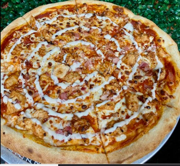 Pizza grande con mozzarella, pollo a la BBQ, tocino y aderezo ranch.