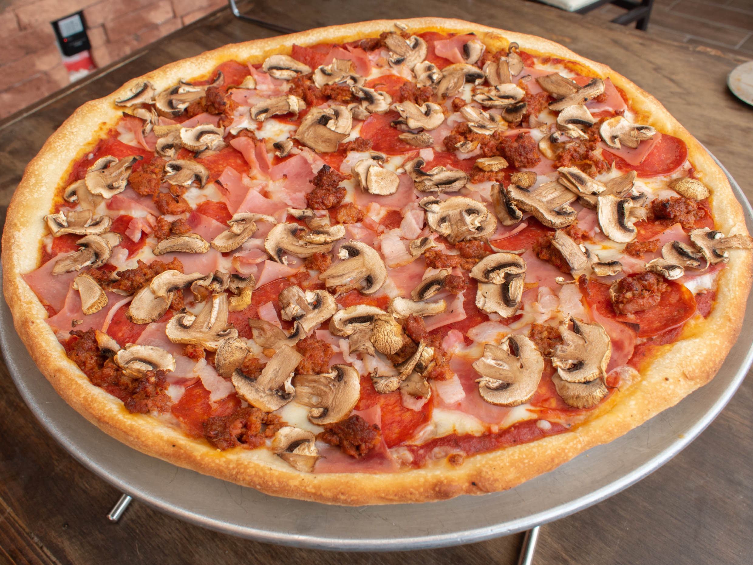 Pizza grande con mozzarella, jamón, pepperoni, chorizo, tocino y champiñones.