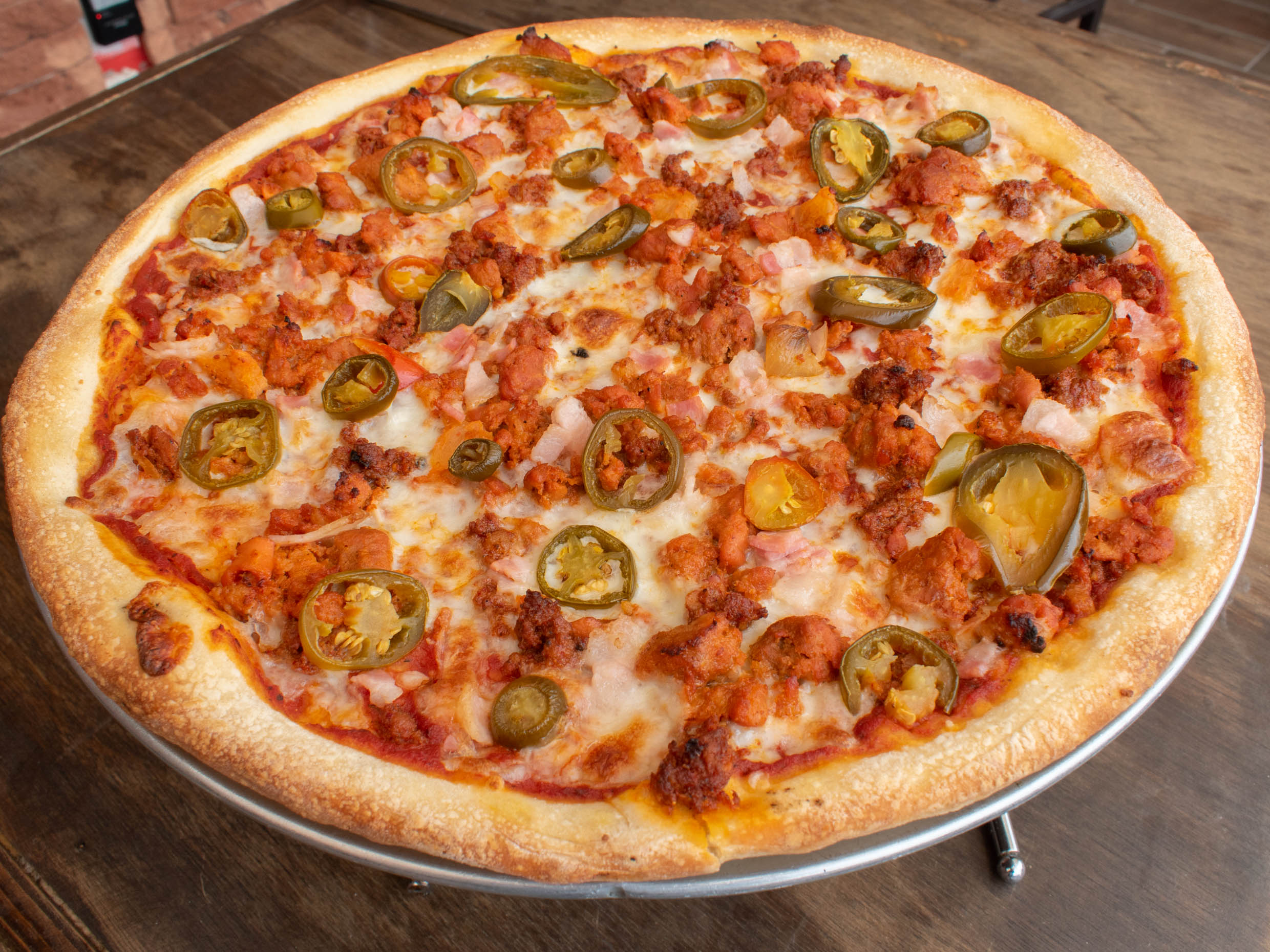 Pizza grande con mozzarella, chorizo, tocino, carne al pastor y chile jalapeño.