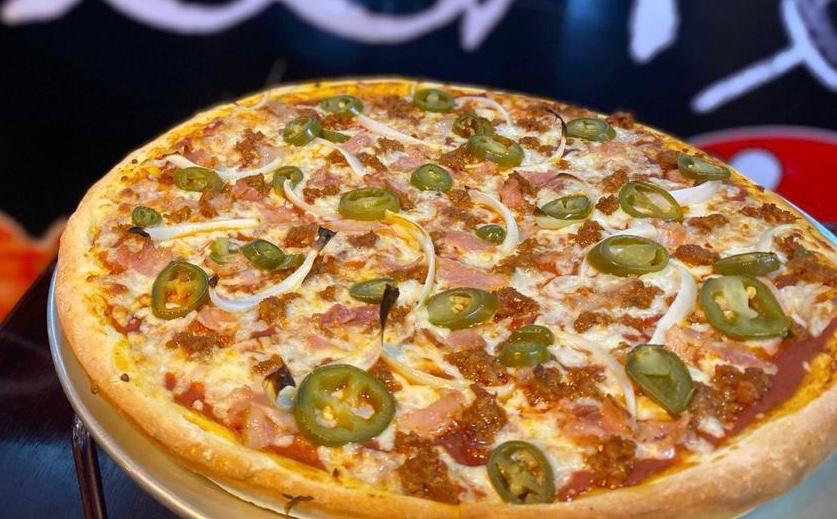 Pizza grande con mozzarella, chorizo, tocino, jalapeño y cebolla.