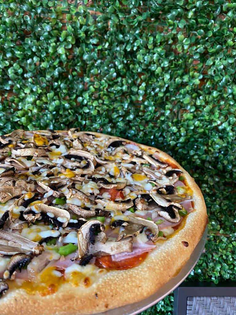 Pizza grande con mozarella, pepperoni, tocino, jamón, champiñones, cebolla, pimiento verde y mezcla de 4 quesos.