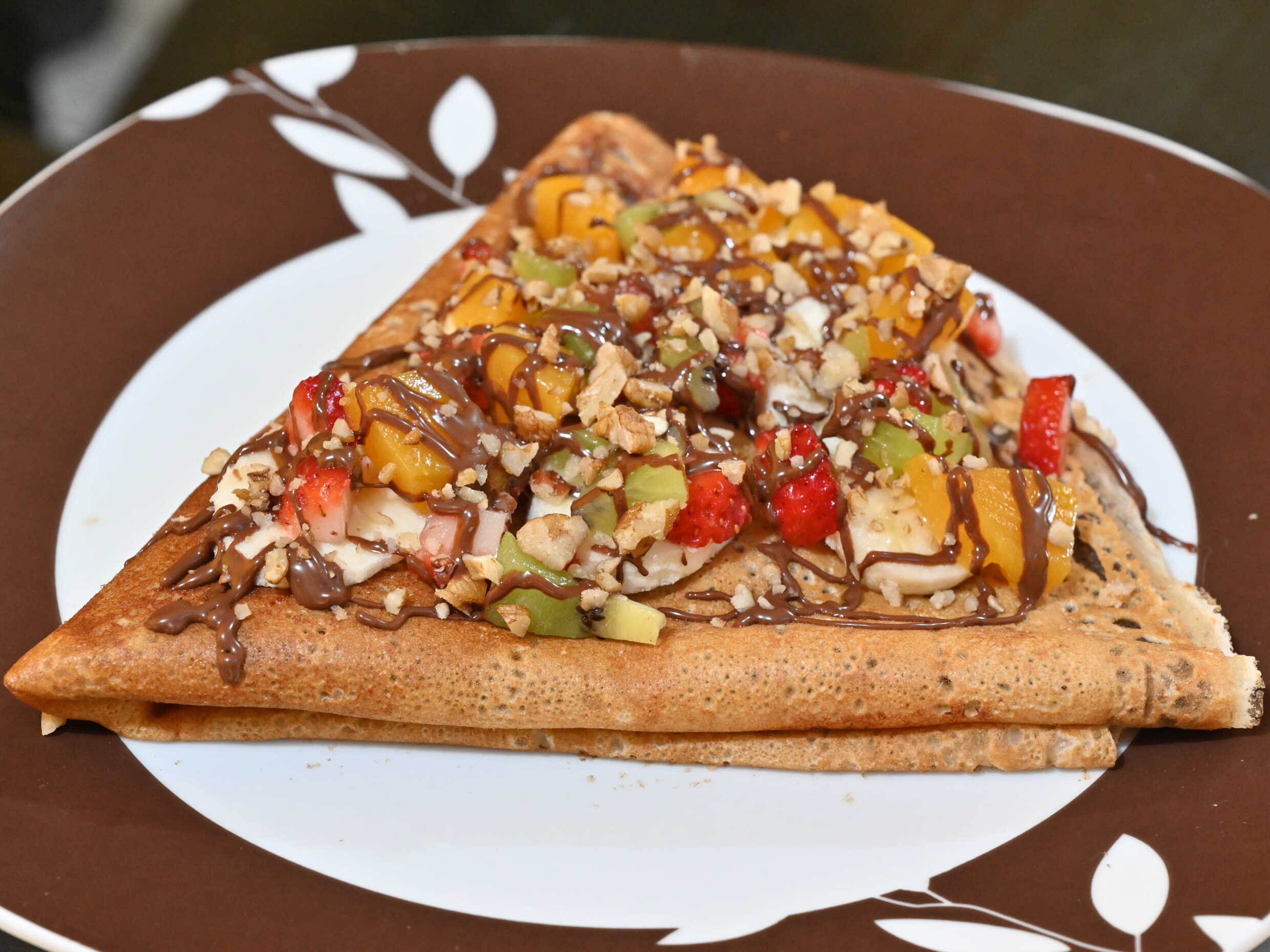Deliciosa crepa de 40 cm con kiwi, fresas, plátano y durazno en almíbar.
