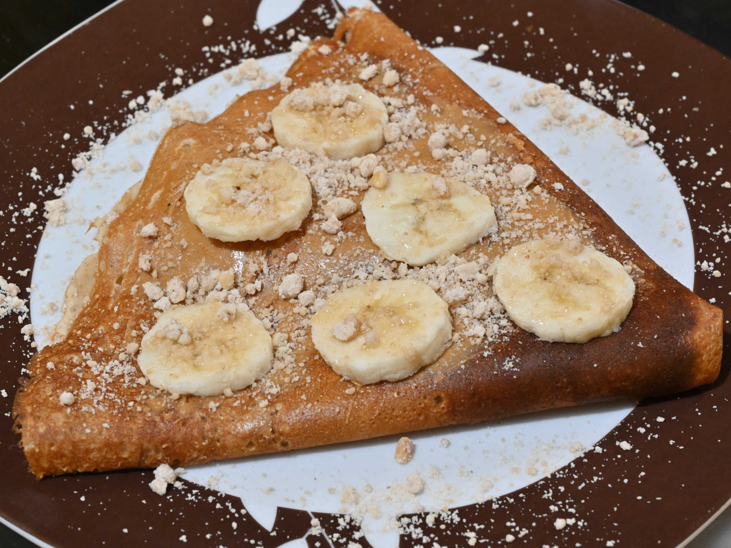 40 Cm rellena de crema de cacahuate, plátano y mazapán espolvoreado.