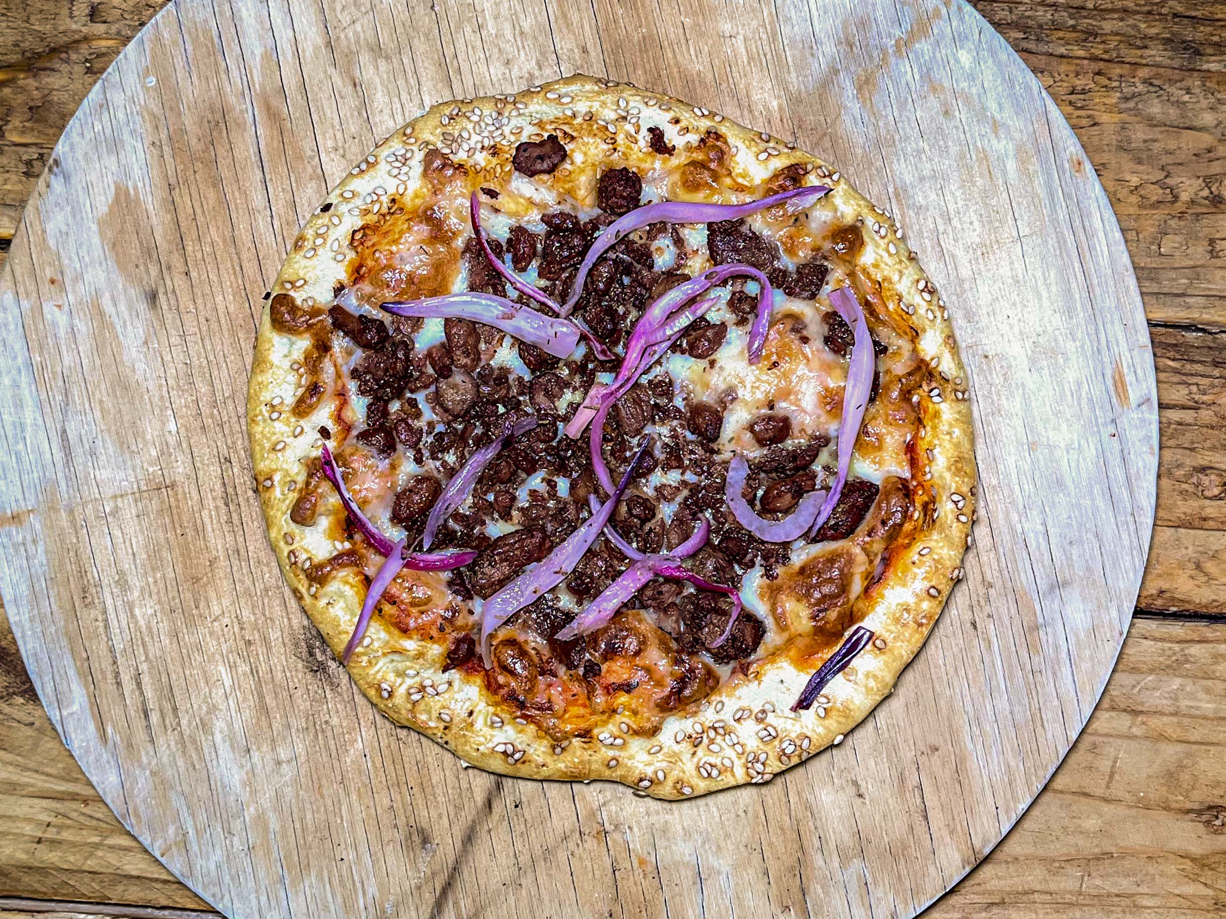 Pizza con 8 rebanadas, salchicha italiana, pimiento, salami y cebolla acompañada de chimichurri.