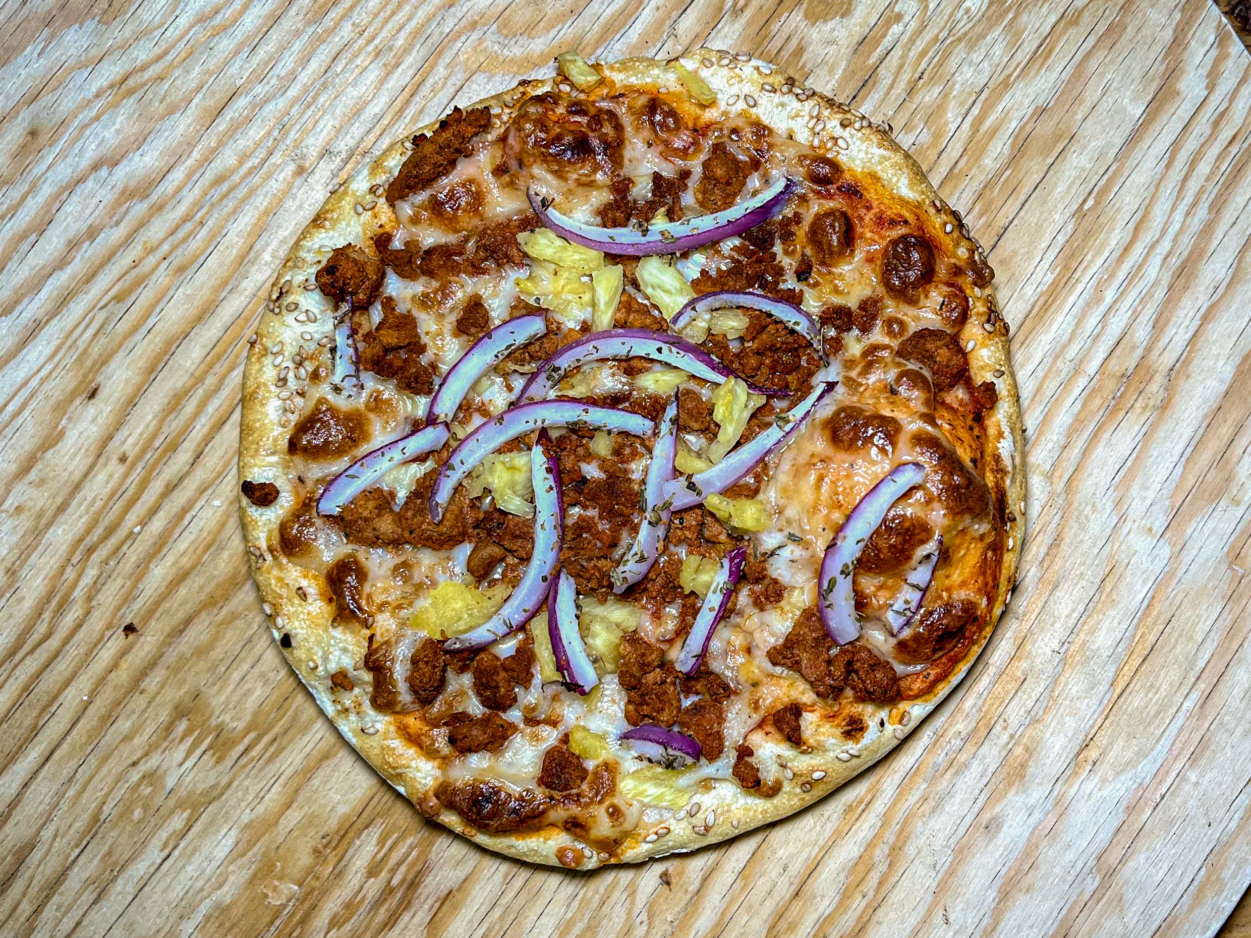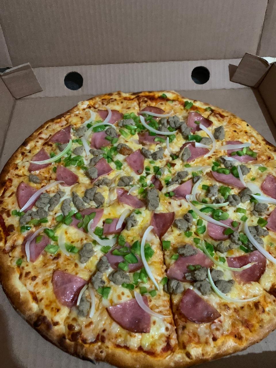 Pizza con 4 rebanadas, chorizo, tocino, salchicha acompañada de chimichurri.