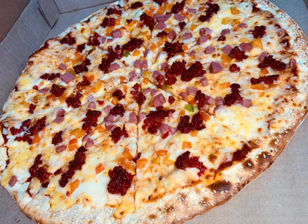 Pizza con 10 rebanadas, jamón, pimiento, champiñones, piña acompañada de chimichurri.