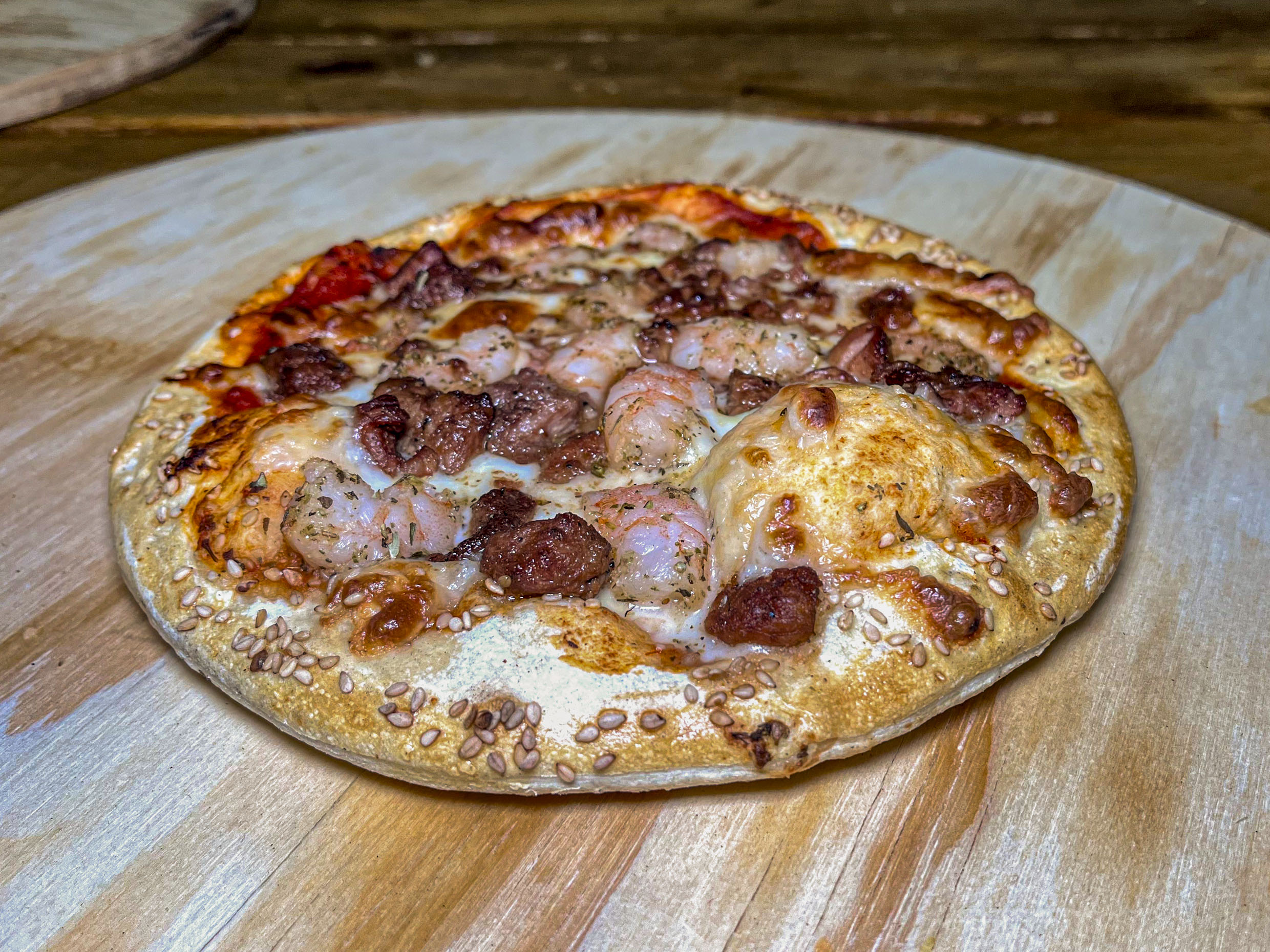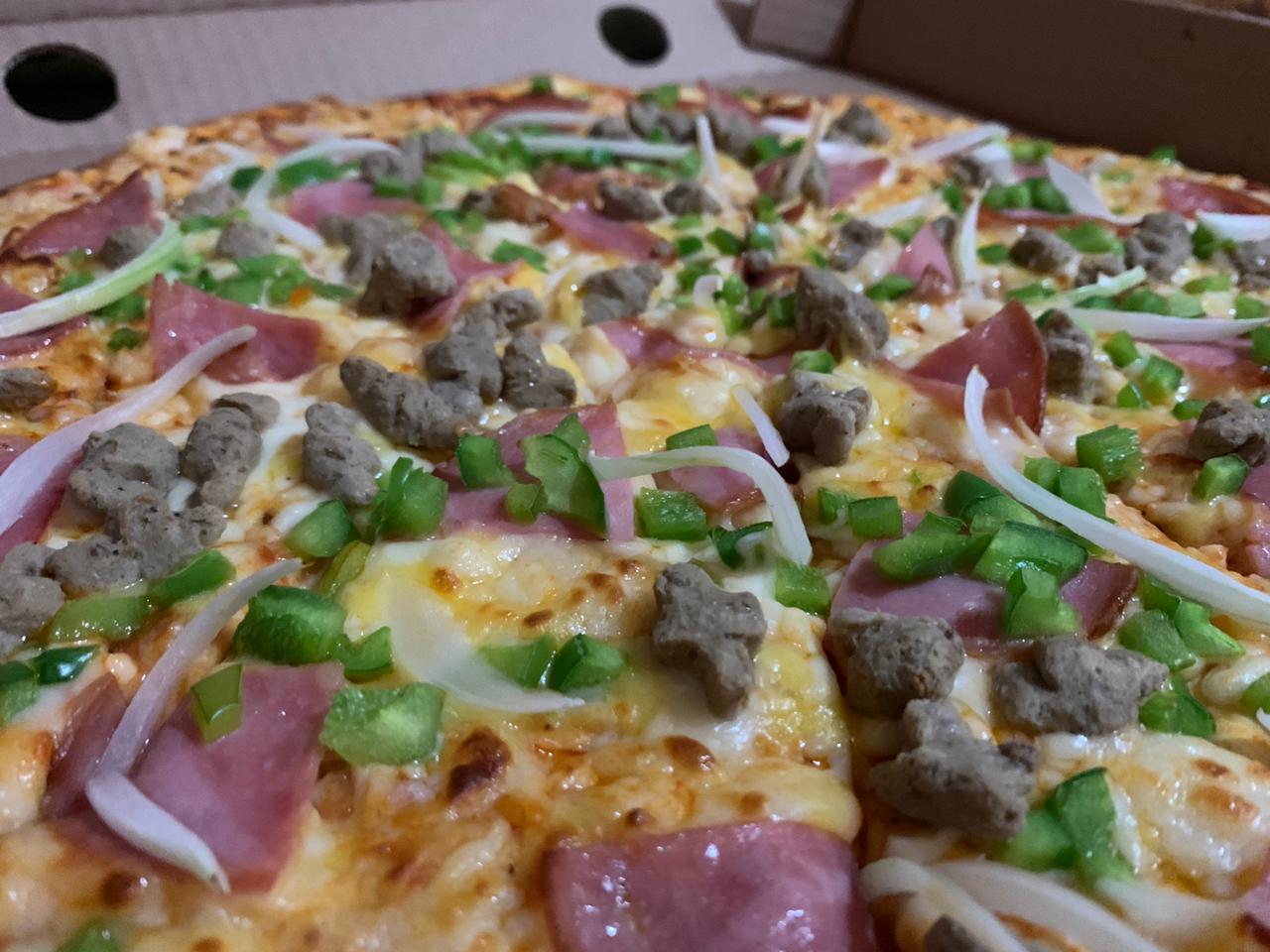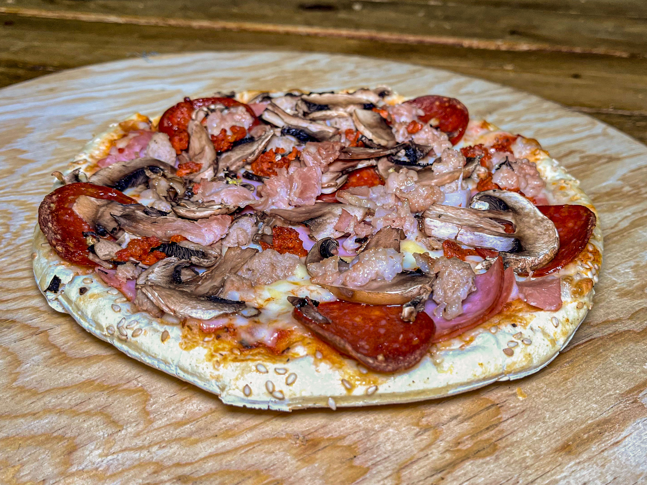 Pepperoni, italiano, chorizo, tocino, salami, champiñones y un toque de queso parmesano.