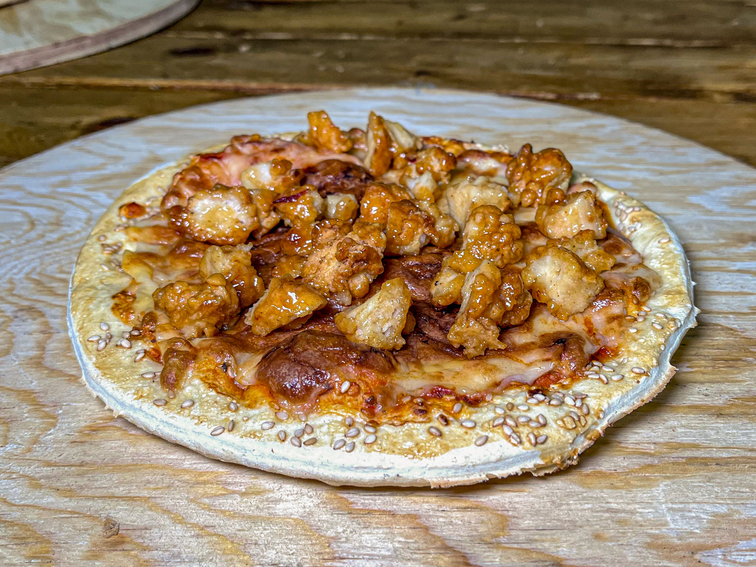 Pechuga de pollo en trozos, bañados en la salsa de tu preferencia.