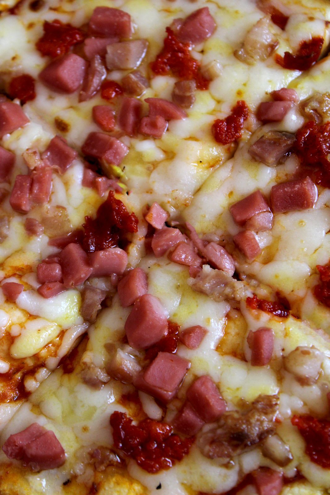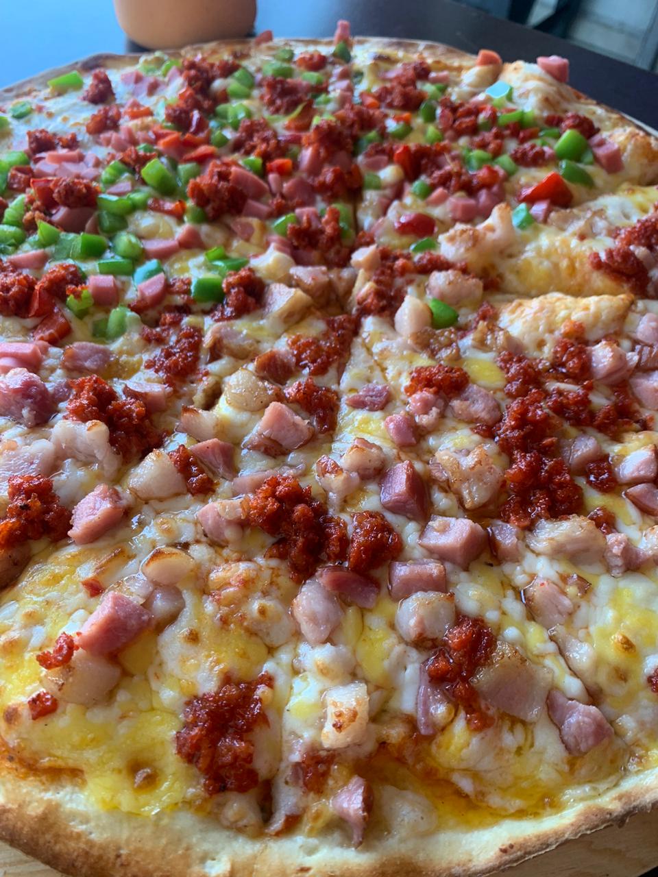 Pizza con 10 rebanadas. Chorizo, tocino, salchicha acompañada de chimichurri