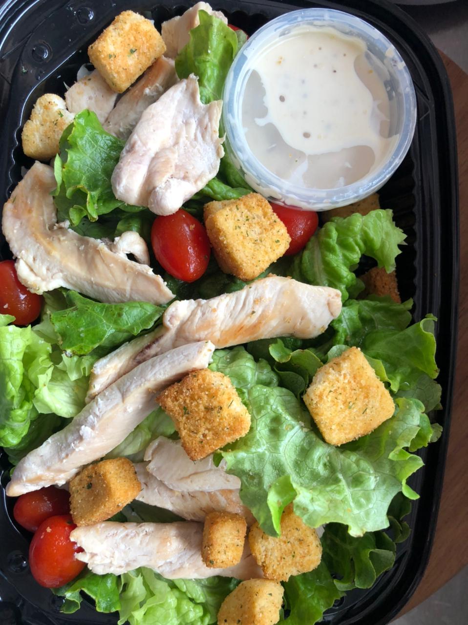 Lechuga, crotones, y pollo a la plancha con aderezo.