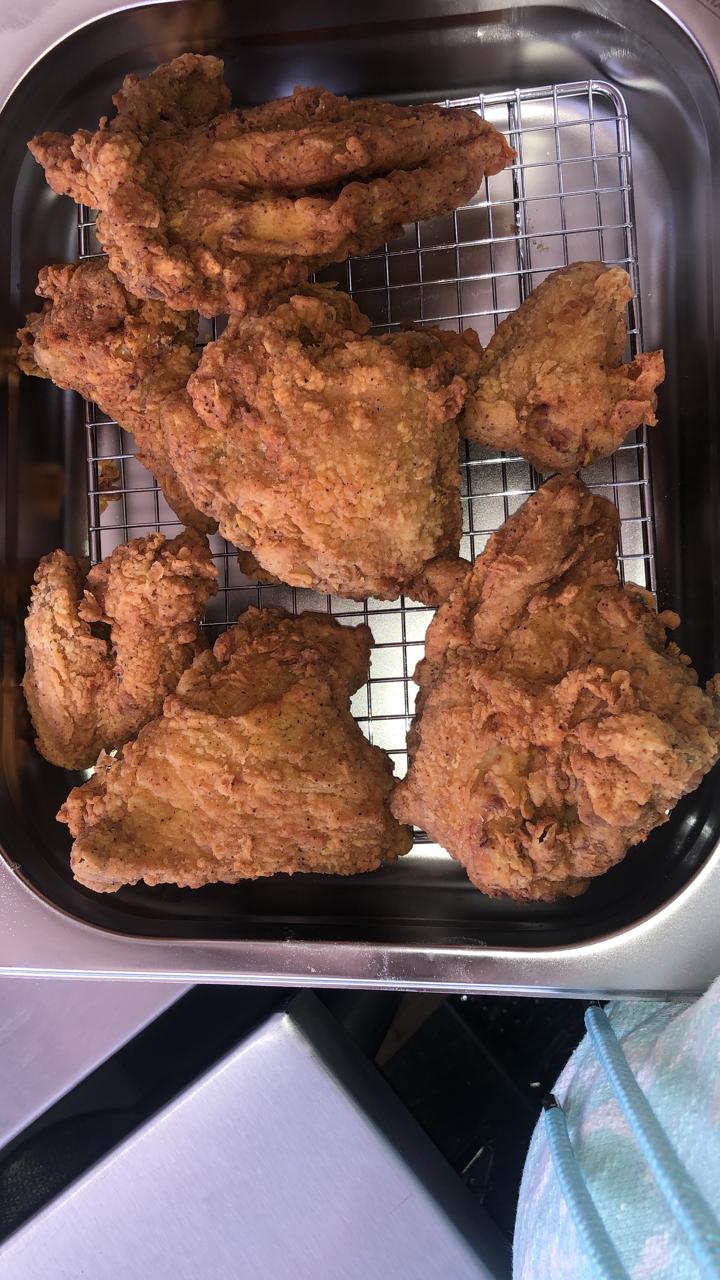 8 Piezas de pollo frito, 4 panes y 2 complementos.