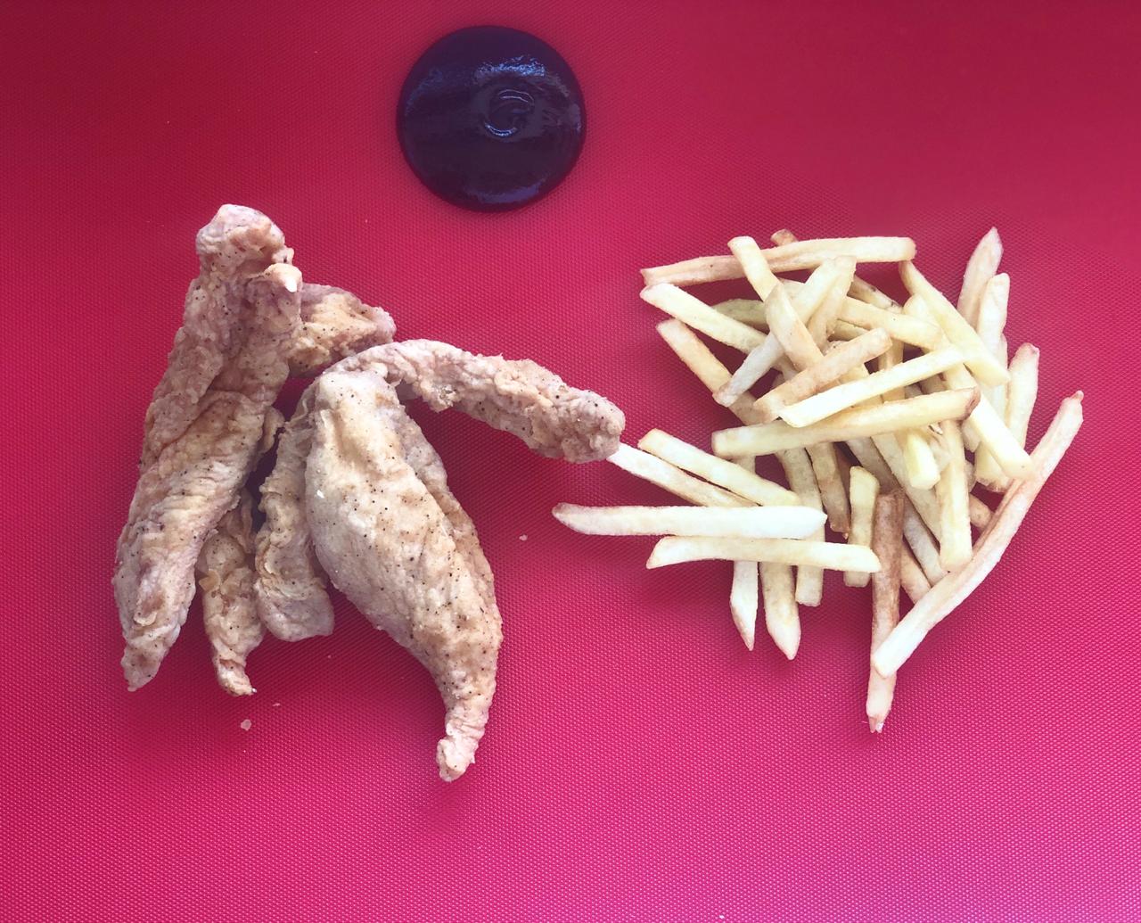 6 Tiras de pechuga de pollo con salsa del monasterio con papas a la francesa.