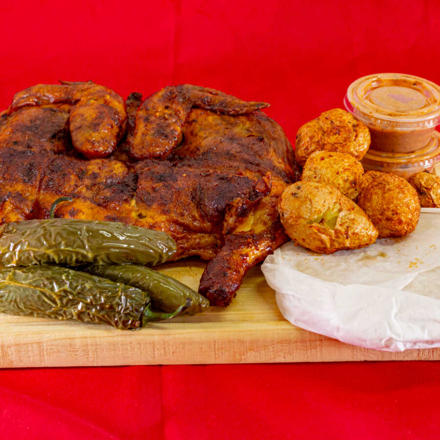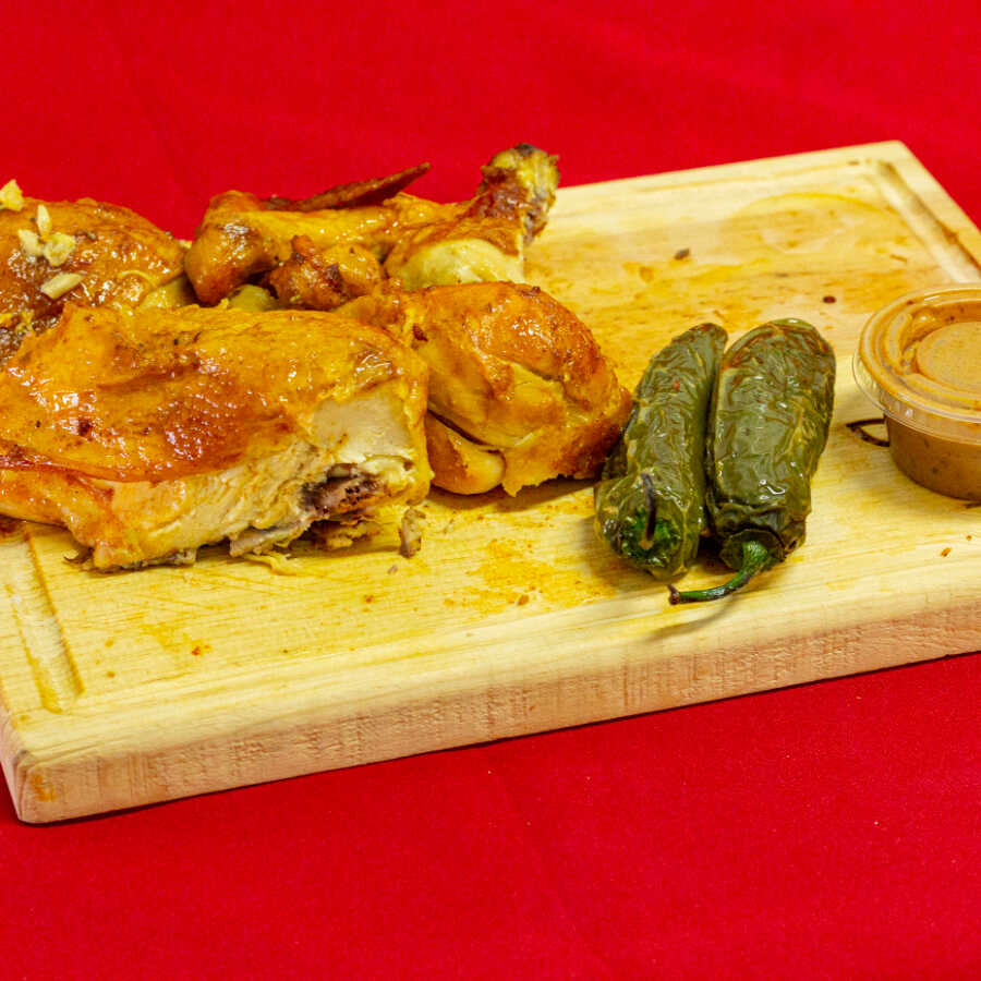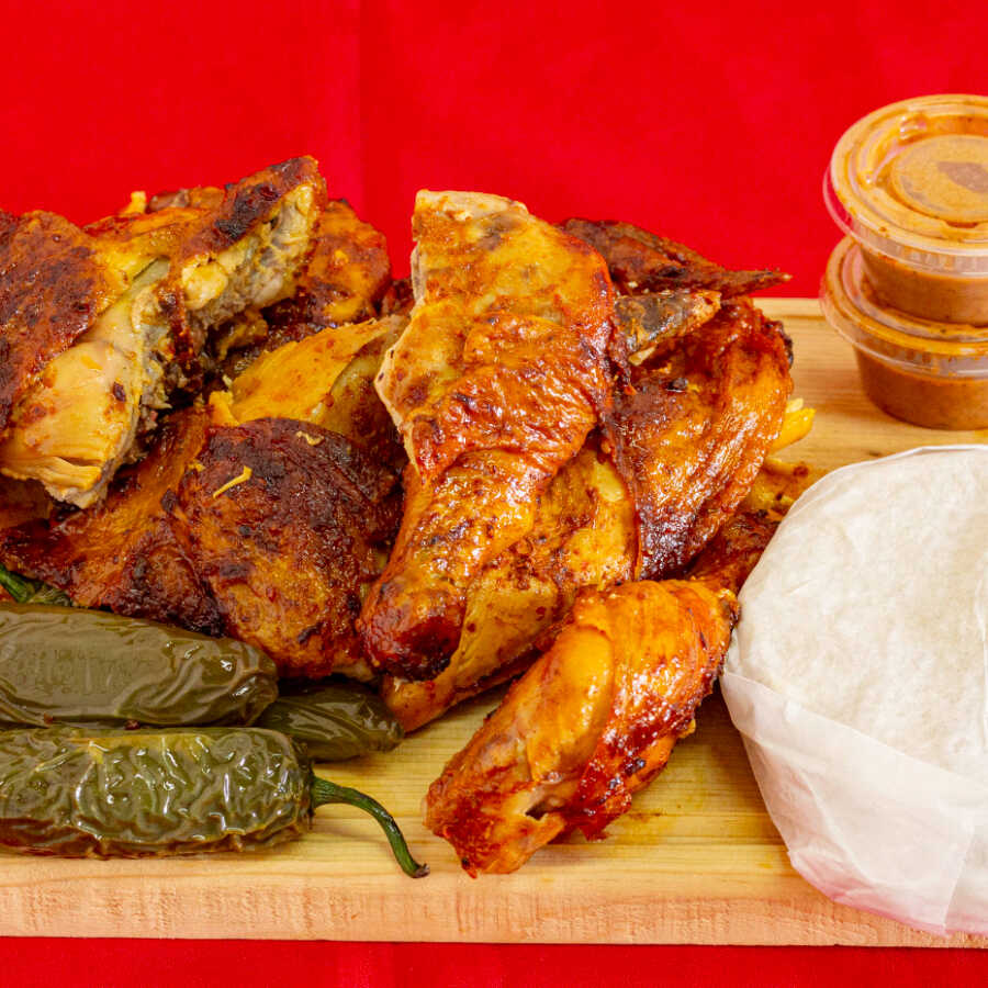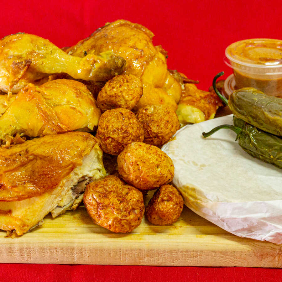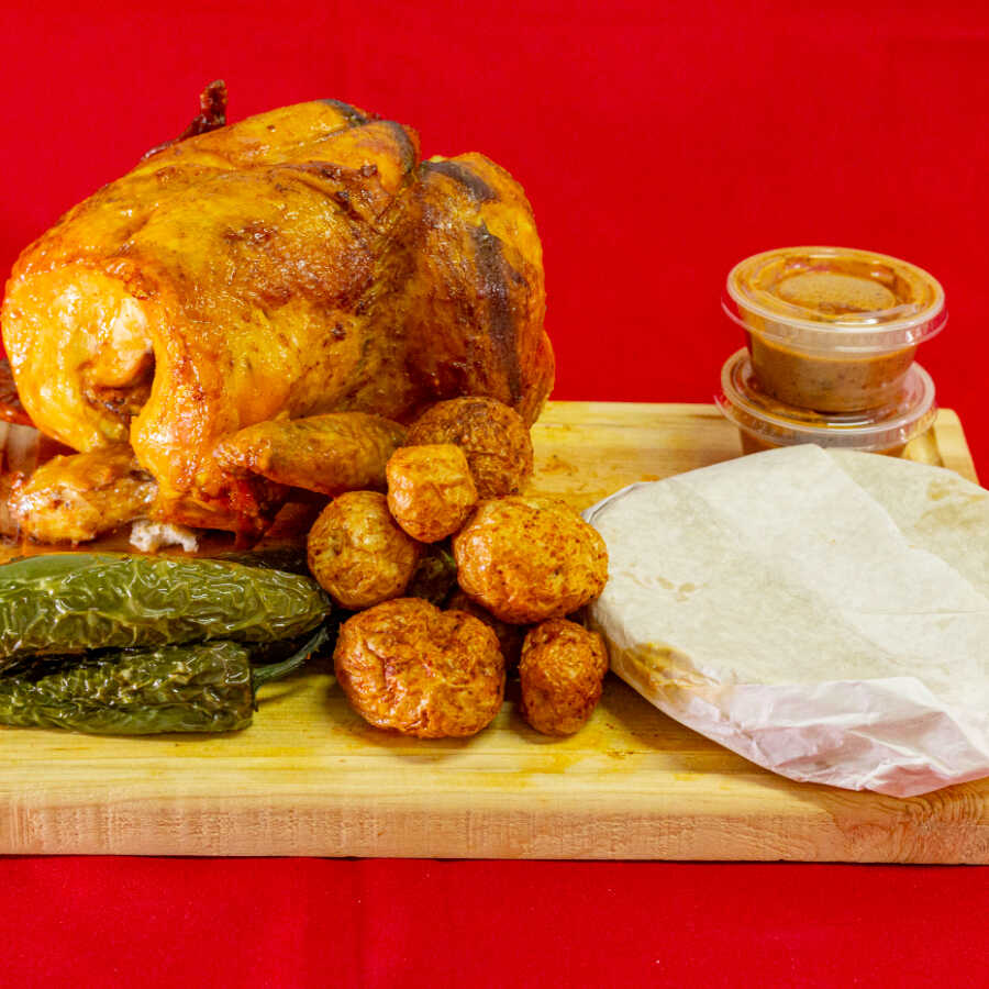 Pollo completo jugoso con un delicioso toque de pimienta y limón, acompañado de papas cambray, chile, salsa, tortillas y 4 flautas crujientes. Perfecto para compartir en familia y disfrutar juntos.