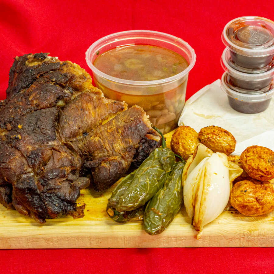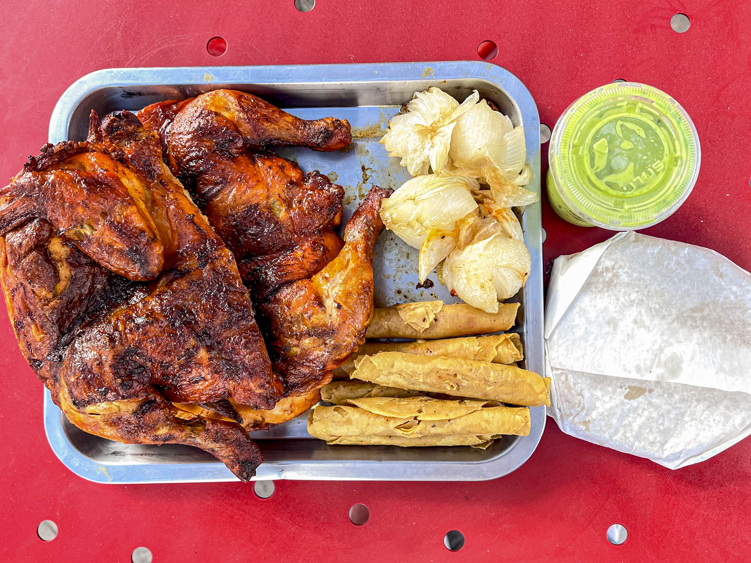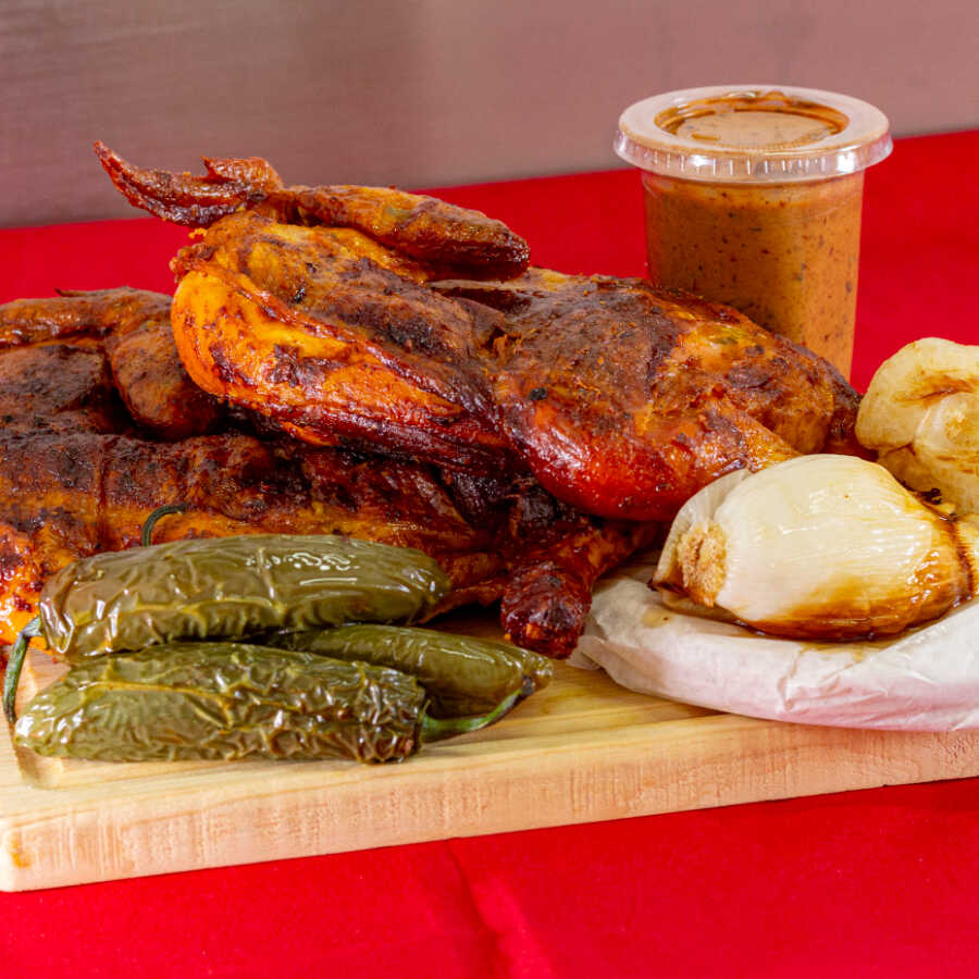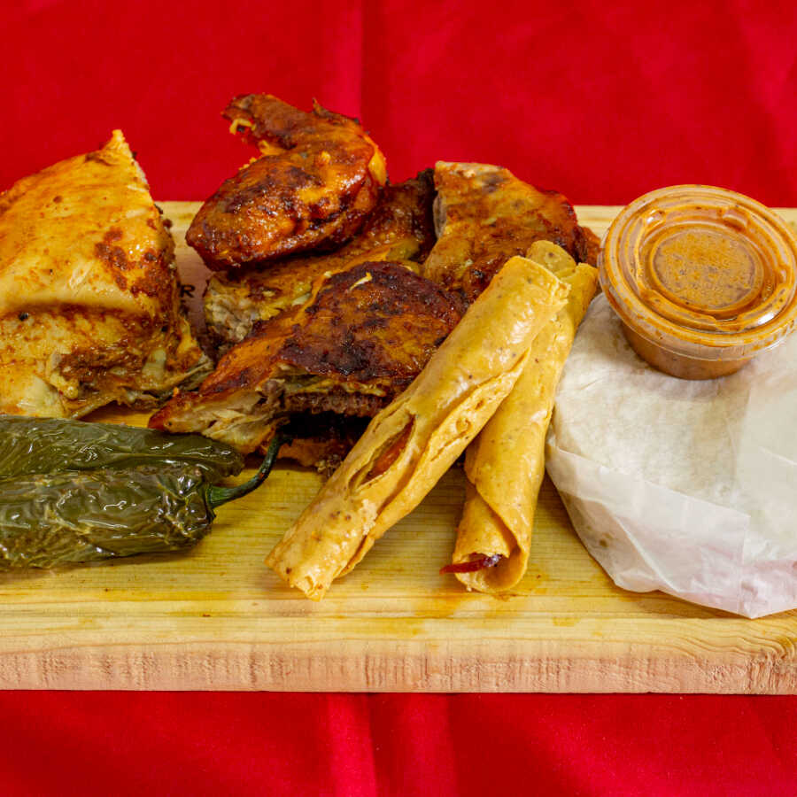 1 Pollo y medio, tortillas, cebollitas cambray, 6 flautas y salsa.