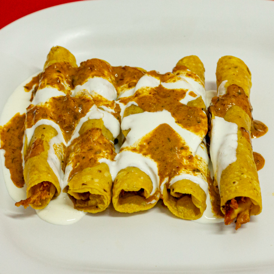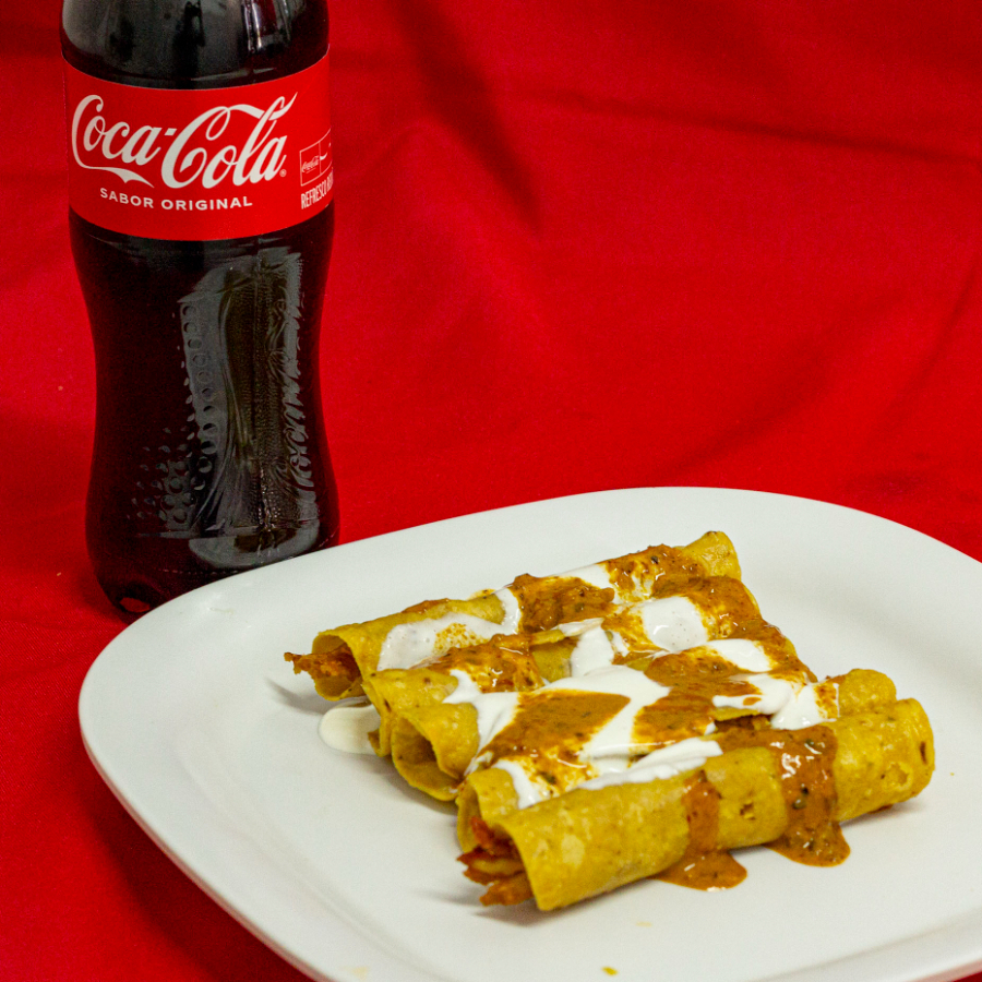5 flautas de pollo + 1 refresco del 600 ml + crema y salsa.