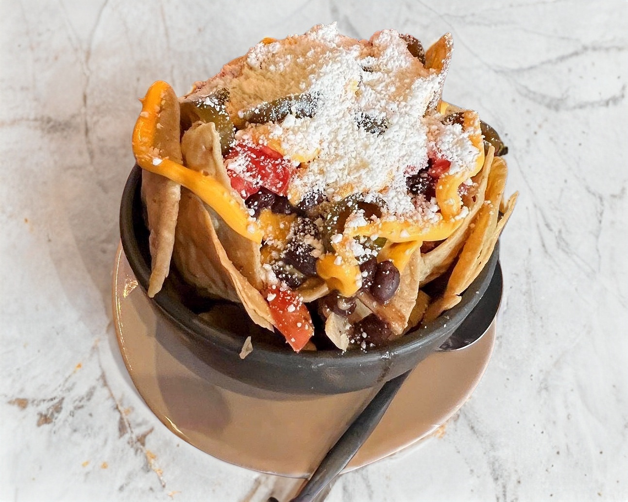 Totopos con frijoles, pico de gallo, queso y chiles en vinagre.