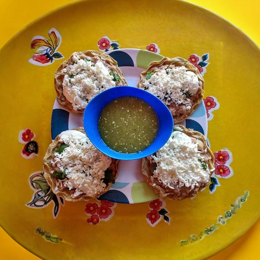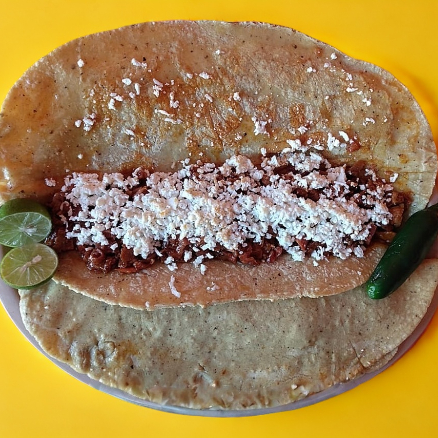 Frijoles, cilantro, cebolla, crema, queso y guisado (al gusto del cliente).