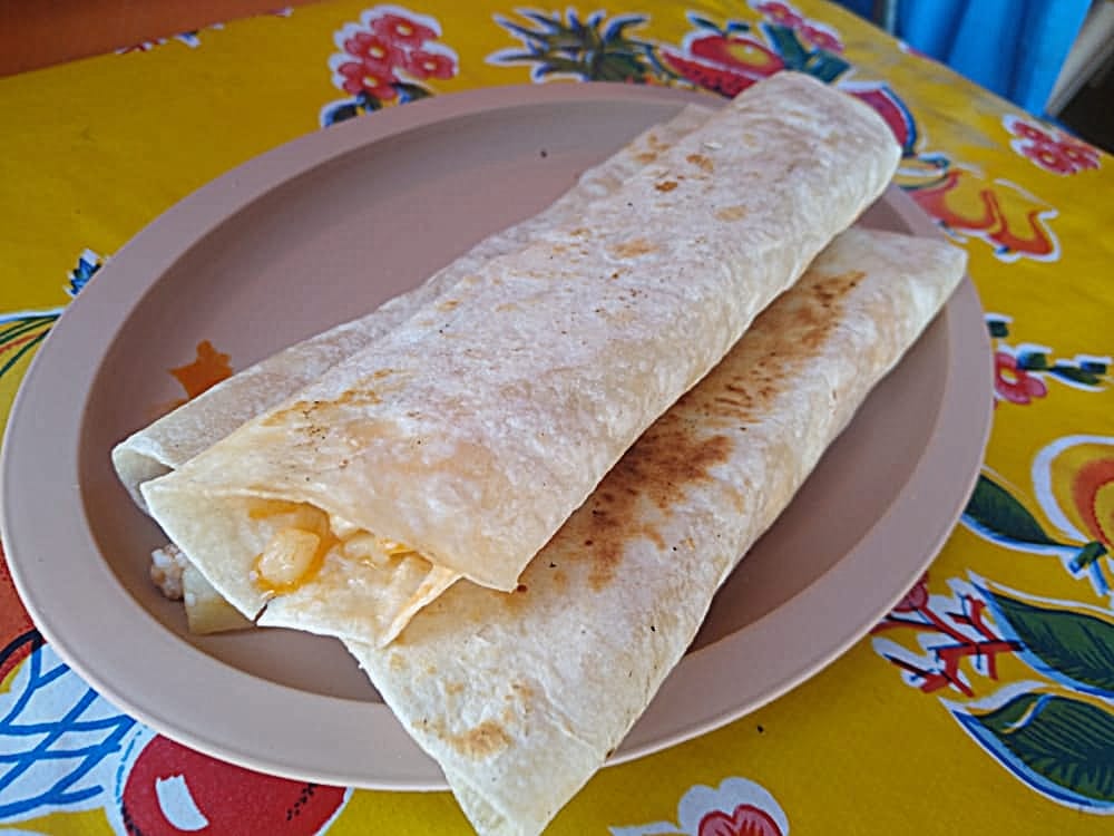 Burritos de tortilla normal, relleno de guisado (al gusto del cliente) y queso.