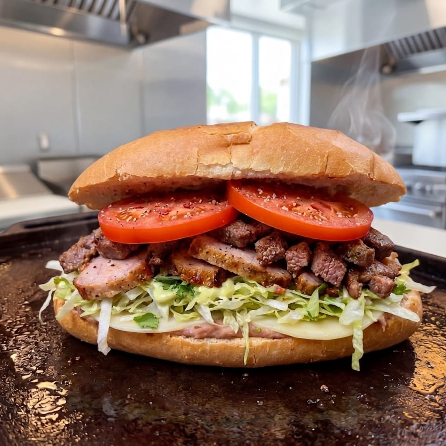 Bolillo, lomo, aguacate, mayonesa, queso blanco, cebolla, jitomate, y salsa o Chiles toreados