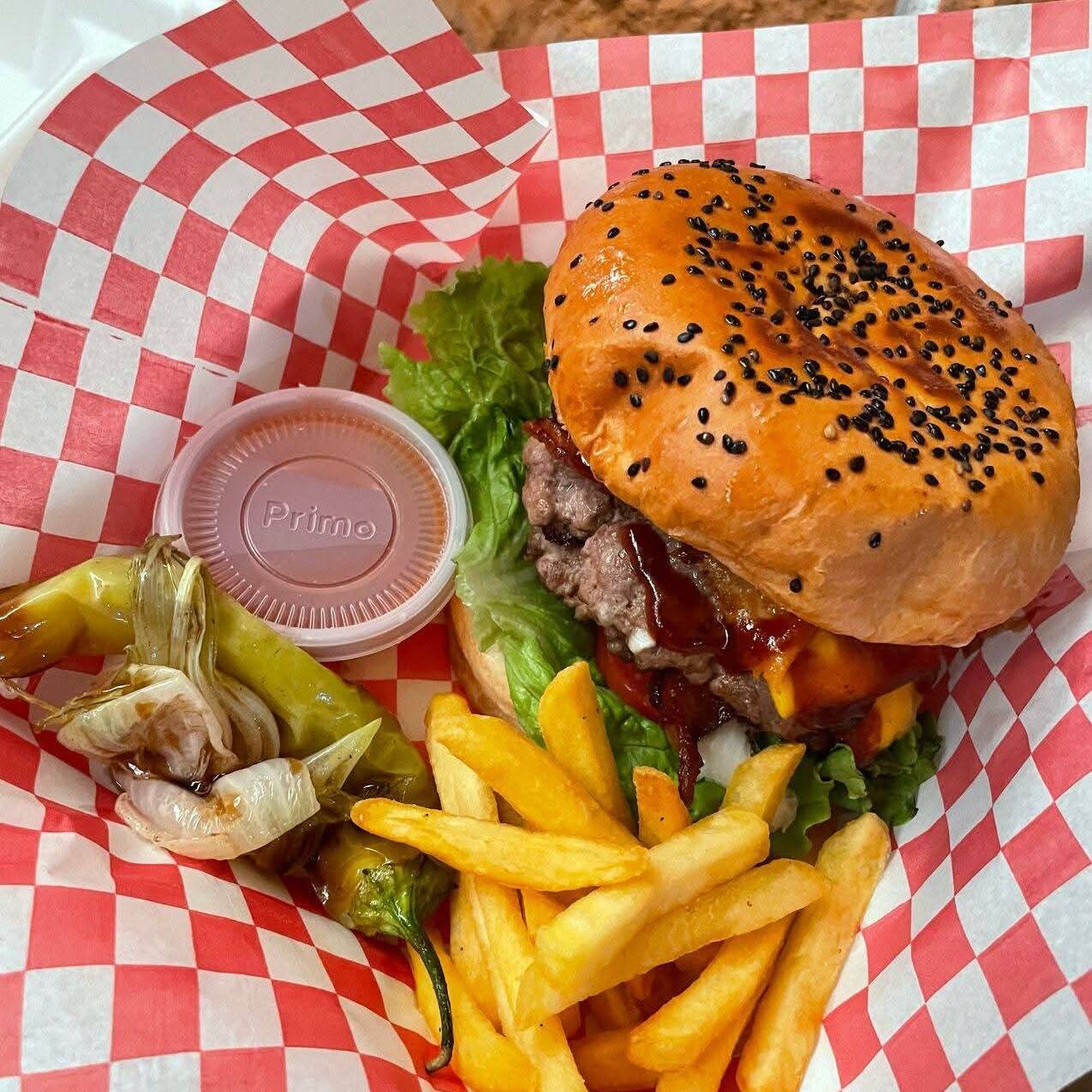 Pan de hamburguesa, carne hecha en casa, lechuga, aguacate, jitomate, mayonesa, jamón, queso amarillo y su chilito vinagre, catsup, mostaza,