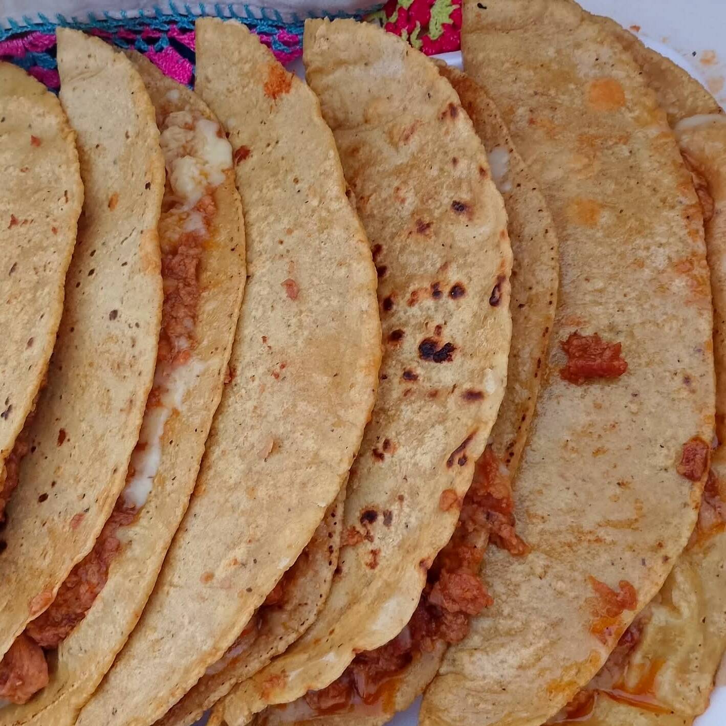 Tortilla hecha de maíz con opción al guisado de tu agrado chicharrón, frijoles con queso, rajas con queso, mole con arroz, bisteck, salchichón, papás, desebrada de res, desebrada de pollo, chicharro