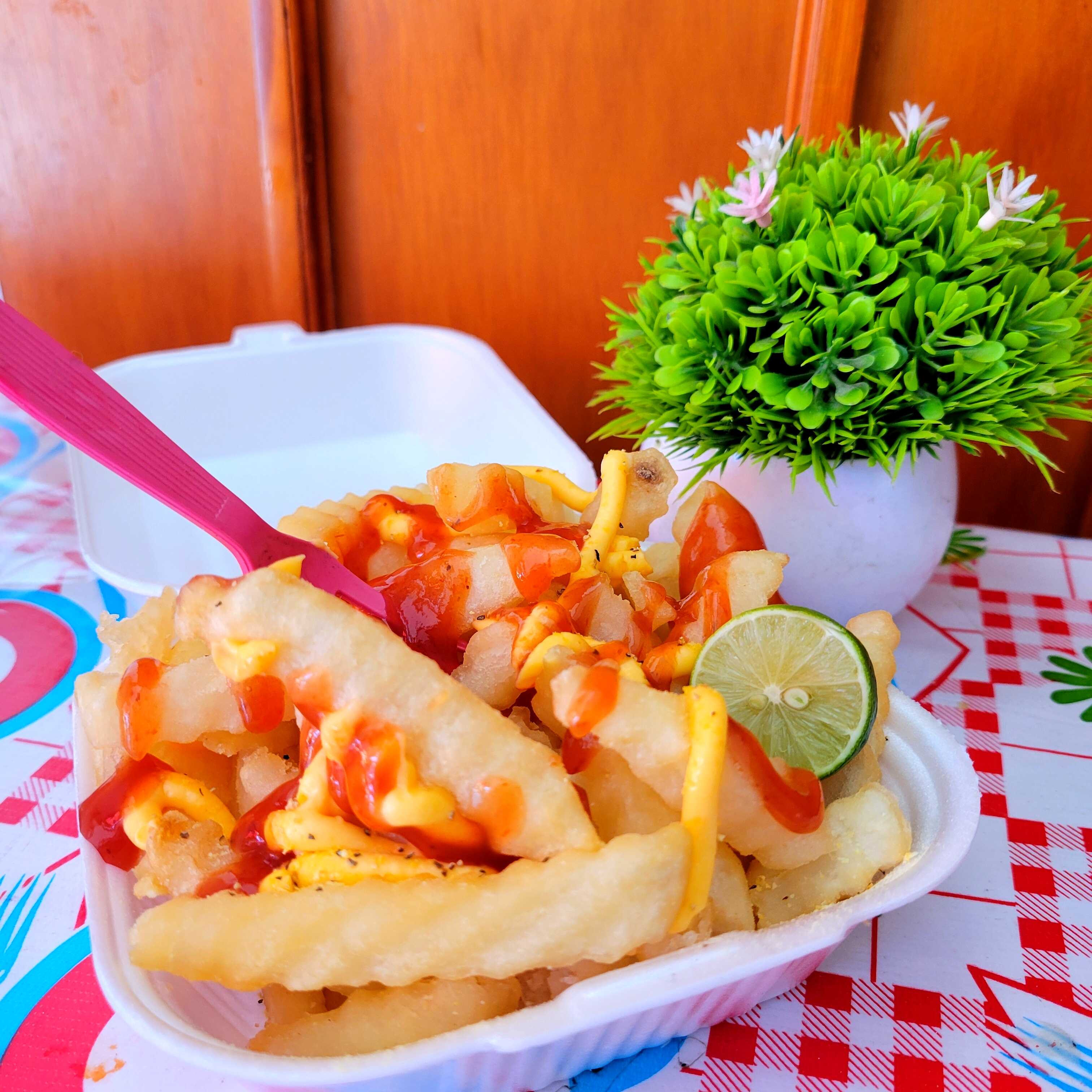 Papás curly, con aderezos, catsup, queso amarillo, salsa valentina y pimienta limon